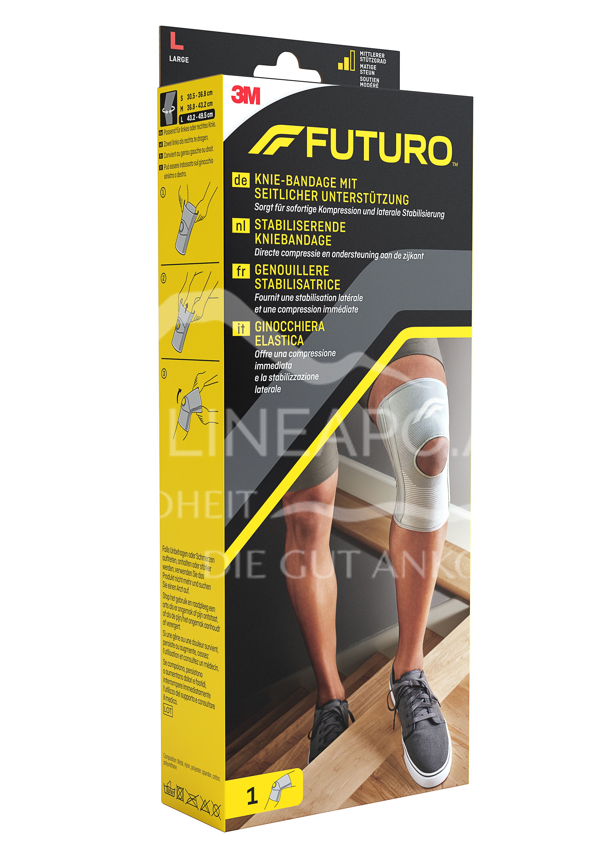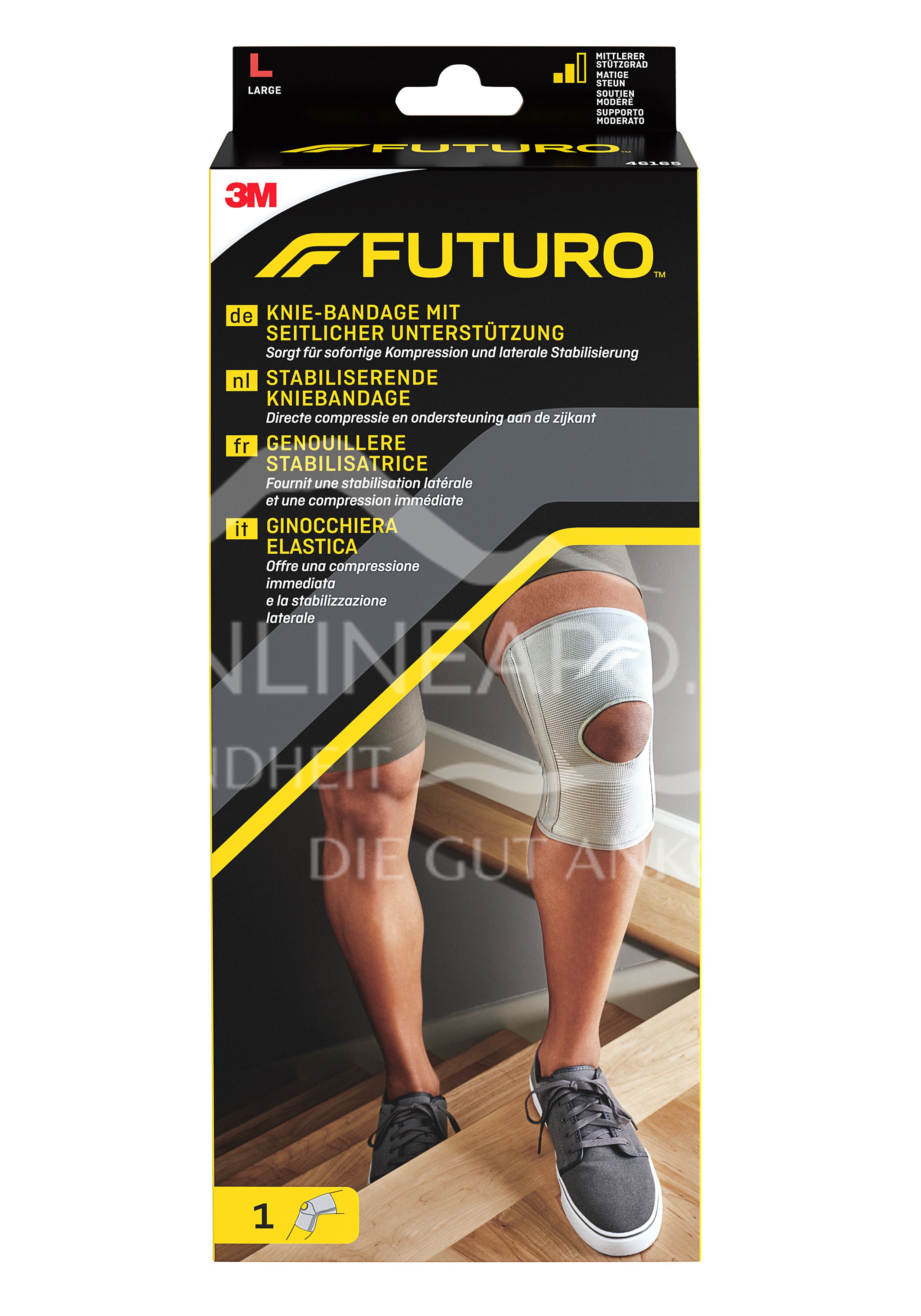 Die FUTURO™ Knie-Bandage mit seitlicher Unterstützung bietet Ihnen komfortable Stabilisierung und ist die perfekte Lösung für den alltäglichen Gebrauch. Diese elastisch gestrickte Knie-Bandage kann unter der Kleidung getragen werden und bietet eine bequeme Unterstützung der Kniemuskulatur. Seitliche Stabilisatoren begrenzen seitliche Bewegungen im Knie, und die Patellaöffnung sorgt für zusätzlichen Komfort. Gönnen Sie Ihrem verletzten Knie mit dieser Knie-Bandage mit seitlicher Unterstützung, was es braucht.