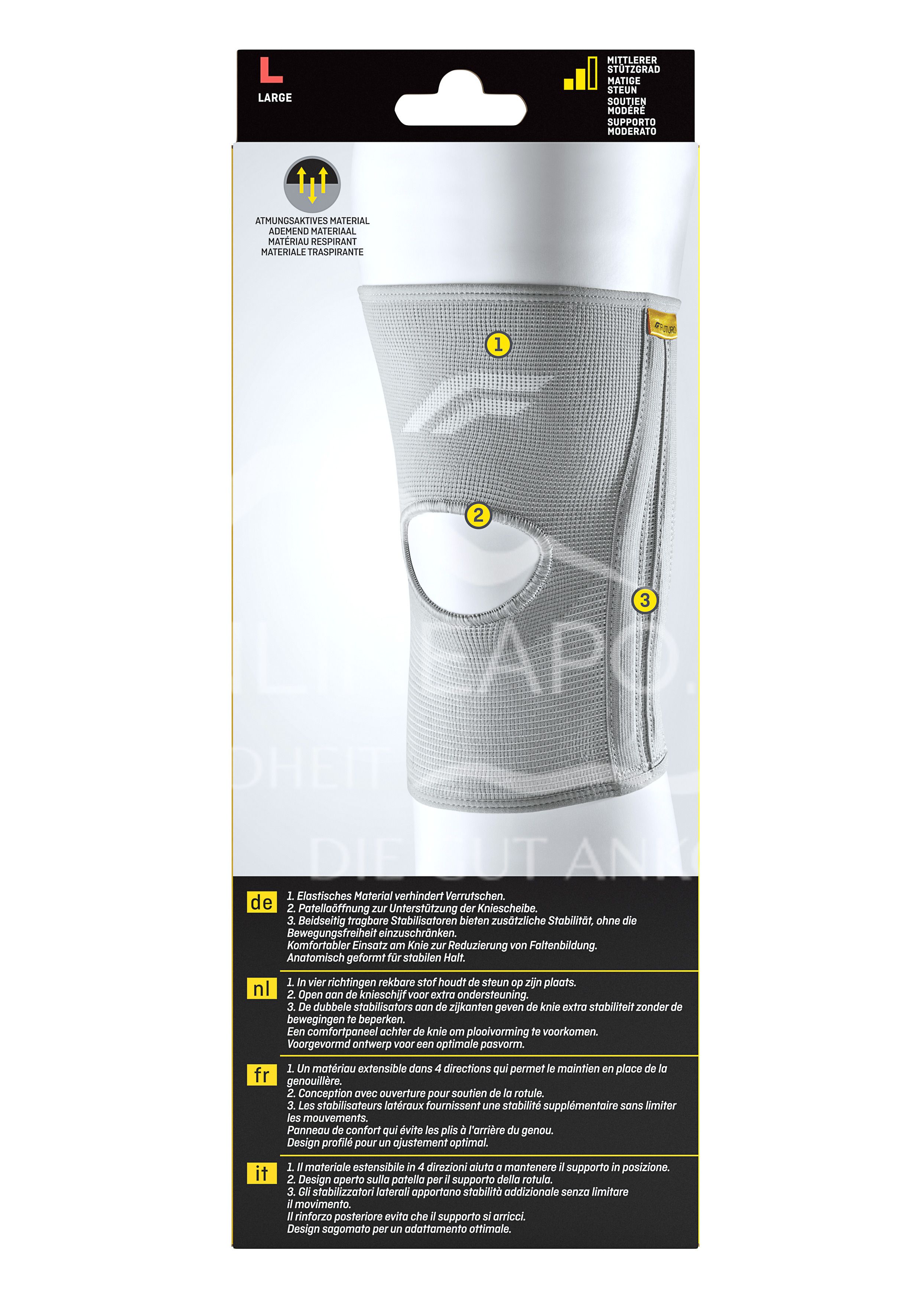 Beidseitig tragbare Stabilisatoren bieten dem Knie zusätzliche Stabilität, ohne die Bewegungsfreiheit einzuschränken. Patellaöffnung zur Unterstützung der Kniescheibe. Doppelt dehnbares Material für optimale Passform.
