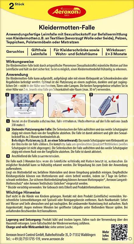 Entdecken Sie die bewährte Aeroxon® Kleidermotten-Falle – Ihre Lösung gegen lästige Motten in Kleiderschränken und Schubladen. Die spezielle Pheromonfalle lockt männliche Kleidermotten an und sorgt für eine effektive Befallsermittlung.