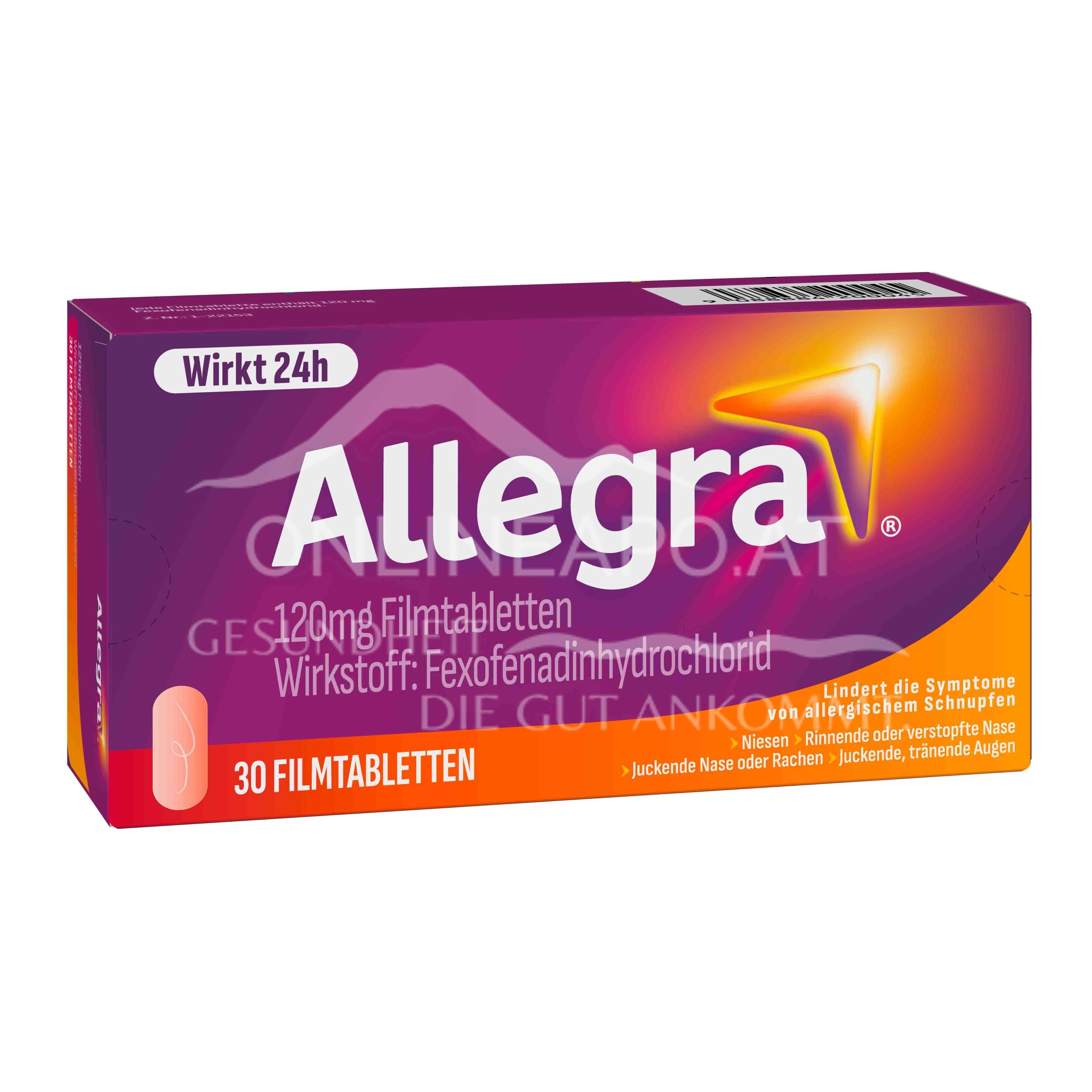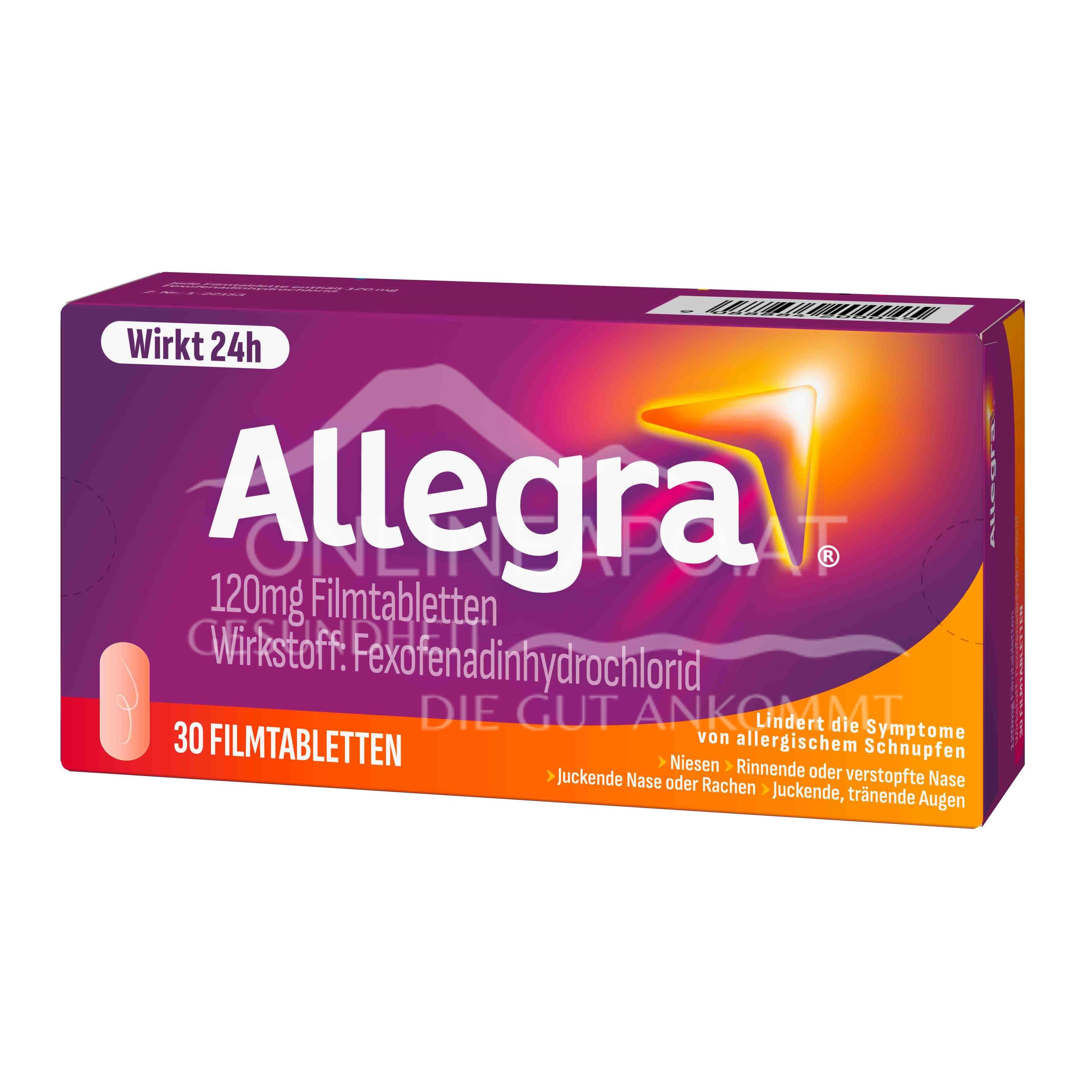 Allegra 120 mg Filmtabletten sind ein rezeptfreies Arzneimittel mit dem Wirkstoff: Fexofenadinhydrochlorid. Wird bei Erwachsenen und Kindern ab dem 12. Lebensjahr verwendet, um die Beschwerden, die bei allergischer Rhinitis (z. B. Heuschnupfen) auftreten, zu lindern.