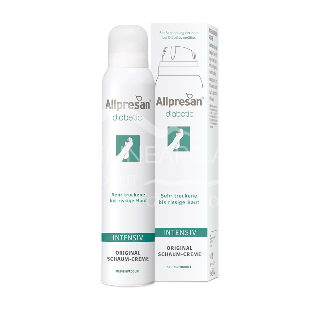 Die Allpresan® diabetic INTENSIV Schaum-Creme ist ein Medizinprodukt - spendet intensiv Feuchtigkeit und unterstützt den Heilungsprozess der Haut für sehr trockene, rissige Haut bei Diabetes.
