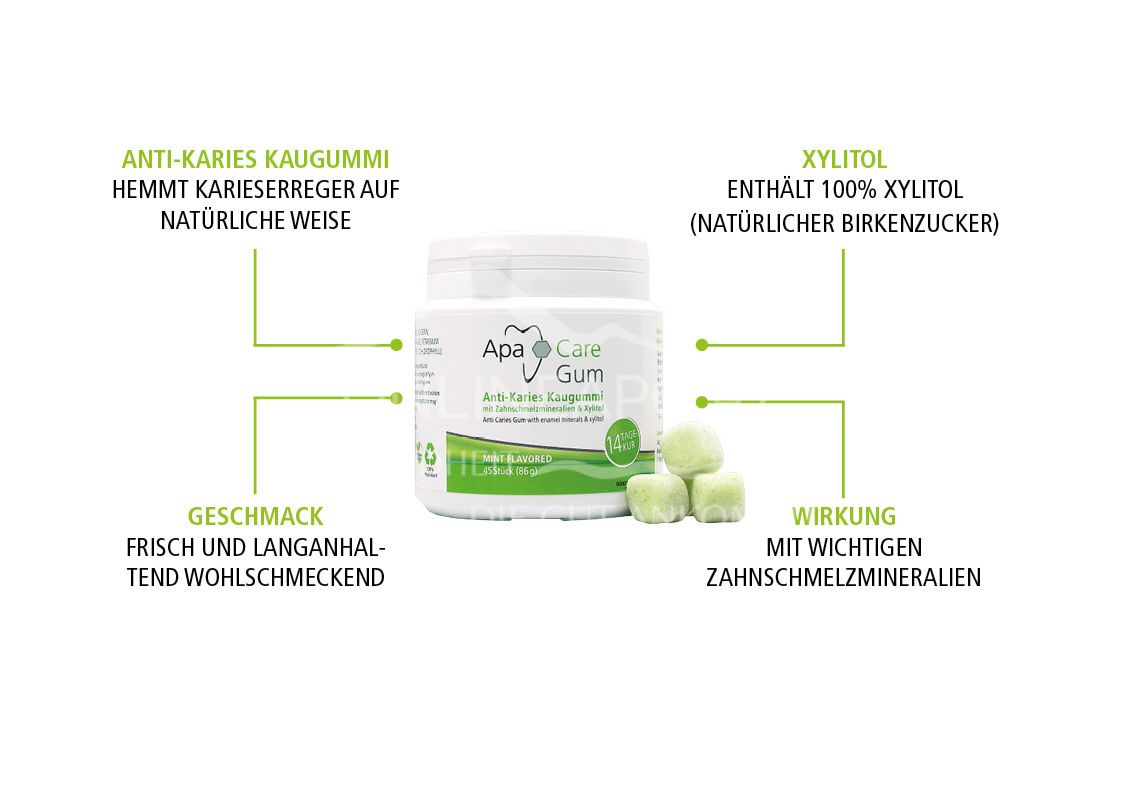 Schützen Sie Ihre Zähne unterwegs mit dem ApaCare Anti-Karies-Kaugummi. 100 % mit Xylitol gesüßt, hemmt er Kariesbakterien und fördert die Remineralisierung des Zahnschmelzes. Ideal nach dem Essen für ein gesundes Lächeln und frischen Atem.