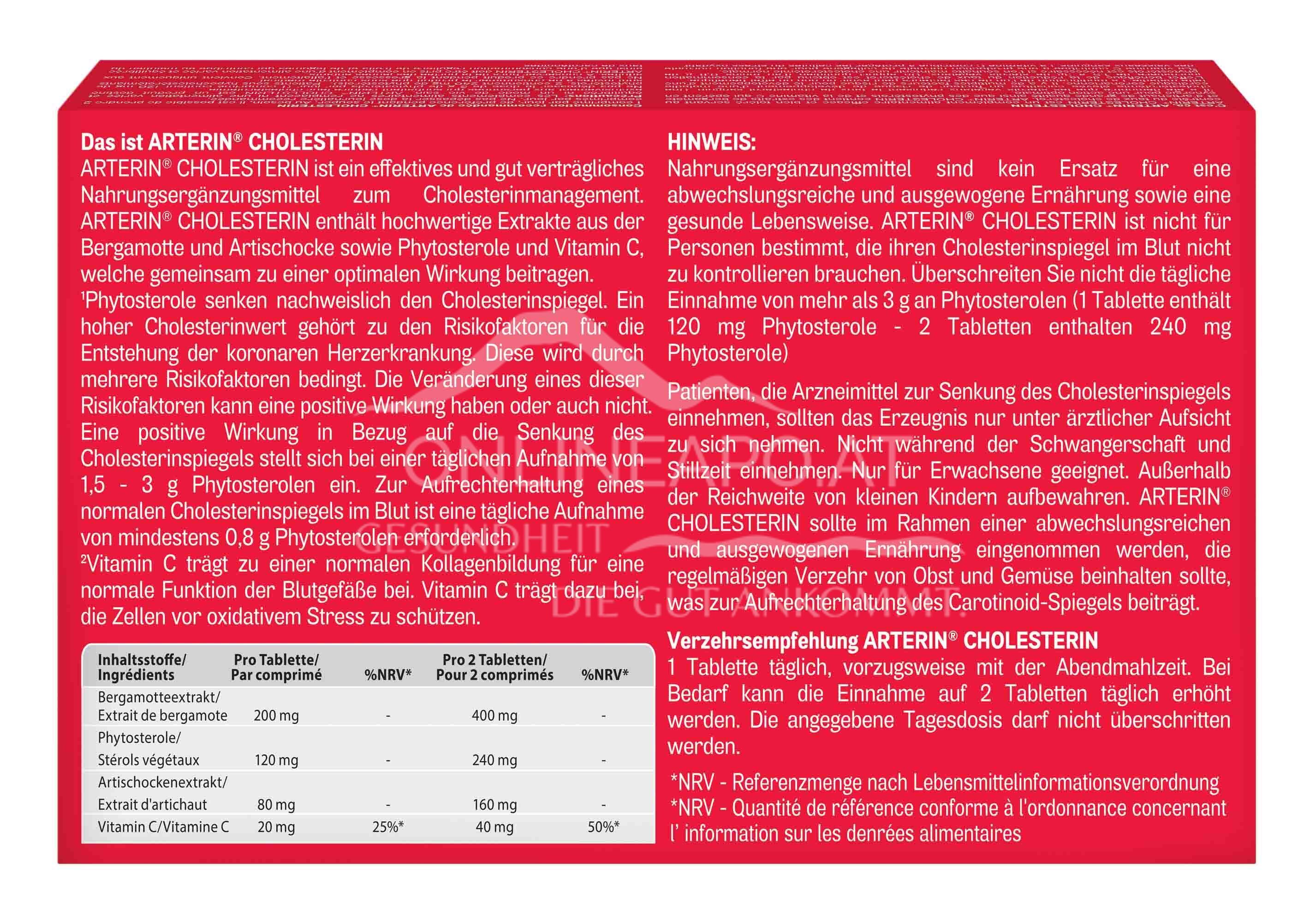 Arterin® Cholesterin ist eine einzigartige, klinisch getestete Formulierung mit pflanzlichen Extrakten und Antioxidantien zum Einsatz bei Cholesterinwerten im Grenzbereich. Die Inhaltsstoffe bilden ein einzigartiges Wirkspektrum und tragen so gemeinsam zu einer optimalen Wirkung auf den Cholesterinspiegel und für eine normale Funktion der Blutgefäße bei. Ist ein wirksames und gut verträgliches Nahrungsergänzungsmittel, basierend auf pflanzlichen Extrakten aus der Bergamotte und Artischocke, zur Senkung und Aufrechterhaltung des Cholesterinspiegels.