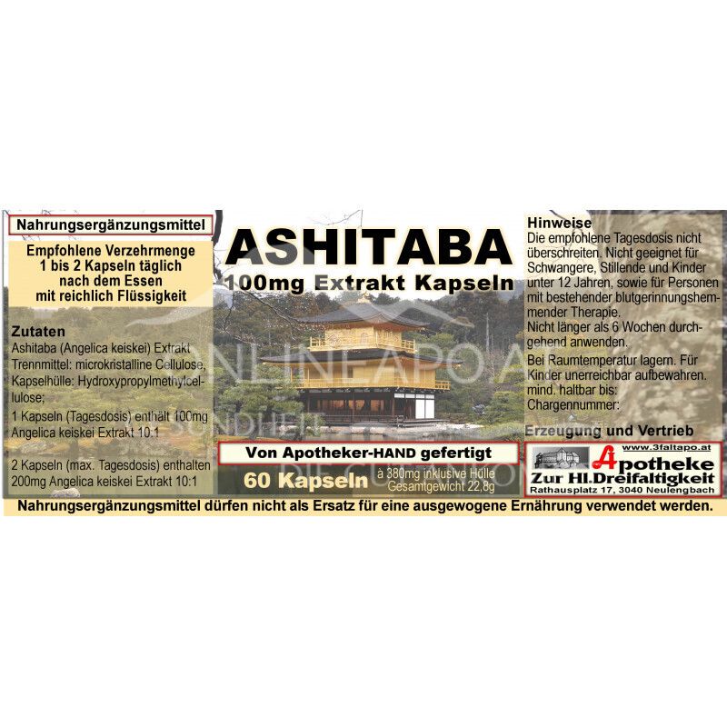 - Zutaten: Ashitaba (Angelica keiskei) Extrakt, Trennmittel: mikrokristalline Cellulose, Kapselhülle: Hydroxypropylmethylcellulose.