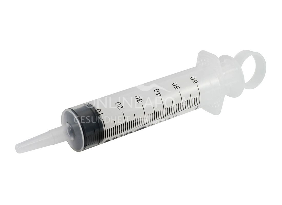 Einmalspritze mit geradem Katheter-Ansatz und Luer-Adapter für Blasenkatheter und Magensonden u. a. zur Blasenspülung.