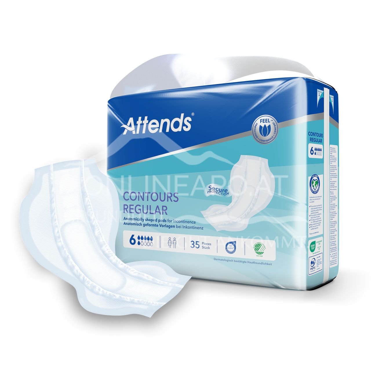 Attends Contours Regular 6 bietet maximale Sicherheit bei schwerer Harninkontinenz. Die anatomische Form und der leistungsstarke Saugkern garantieren Trockenheit und optimalen Auslaufschutz im Alltag.