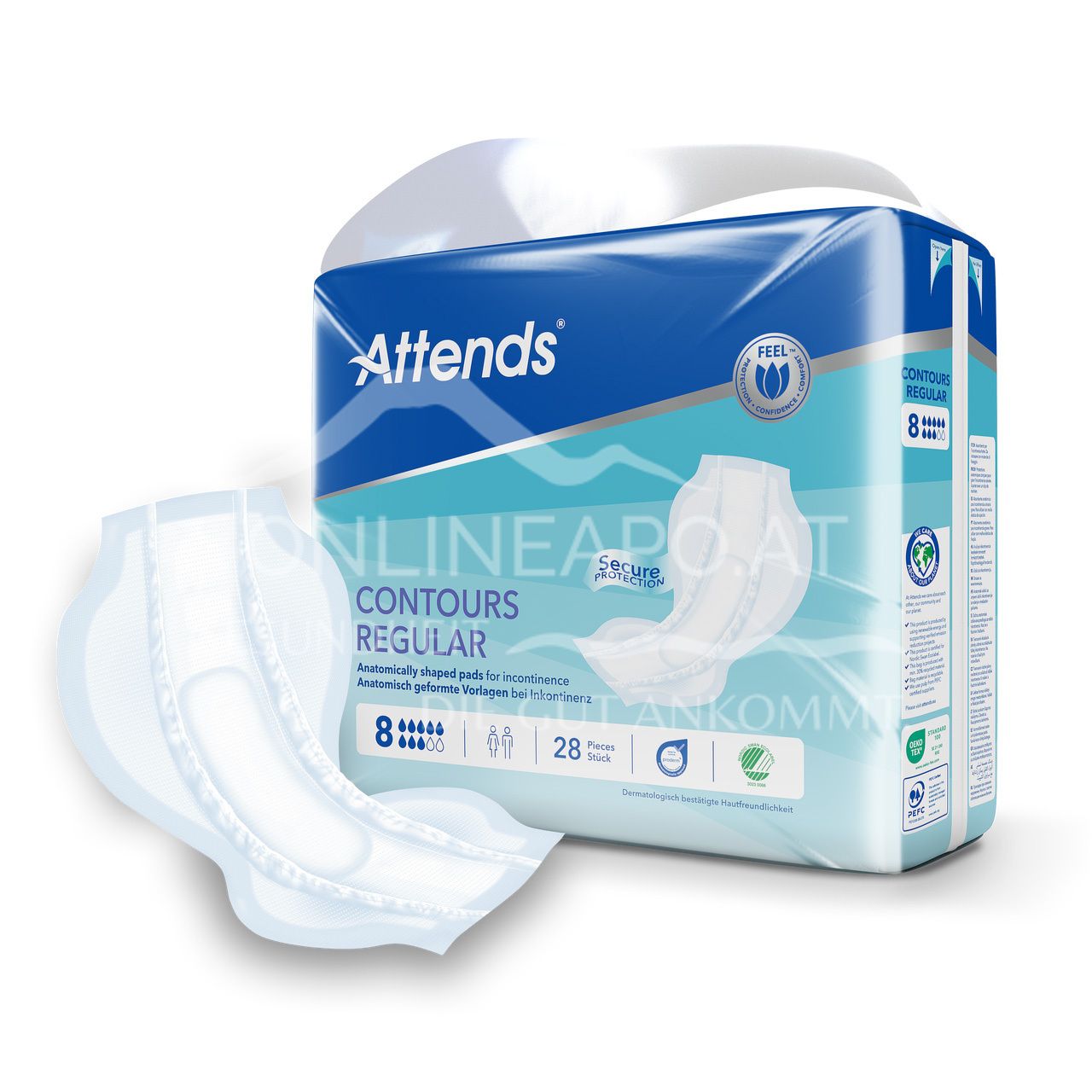 Attends Contours Regular 8 sind ein Sortiment anatomisch geformter Vorlagen bei starker Harn- und/oder Stuhlinkontinenz.
