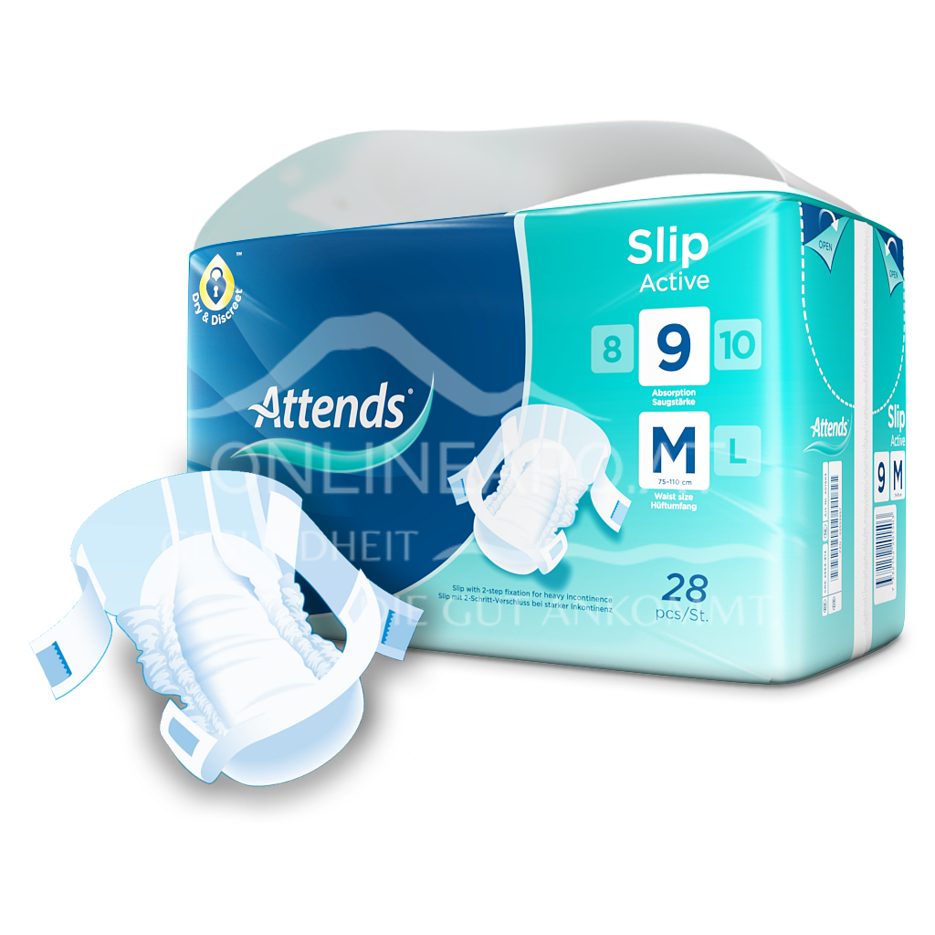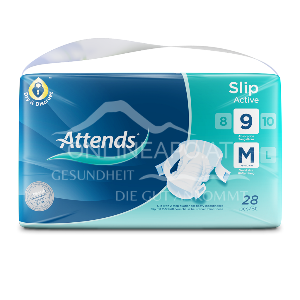 Entdecken Sie den Attends Slip Active 9 M: der Inkontinenzslip mit Saugstärke 9, der speziell für aktive und mobile Nutzer entwickelt wurde. Der 2-Schritt-Verschluss sorgt für eine perfekte, körpernahe Passform. Hautfreundlich & atmungsaktiv.