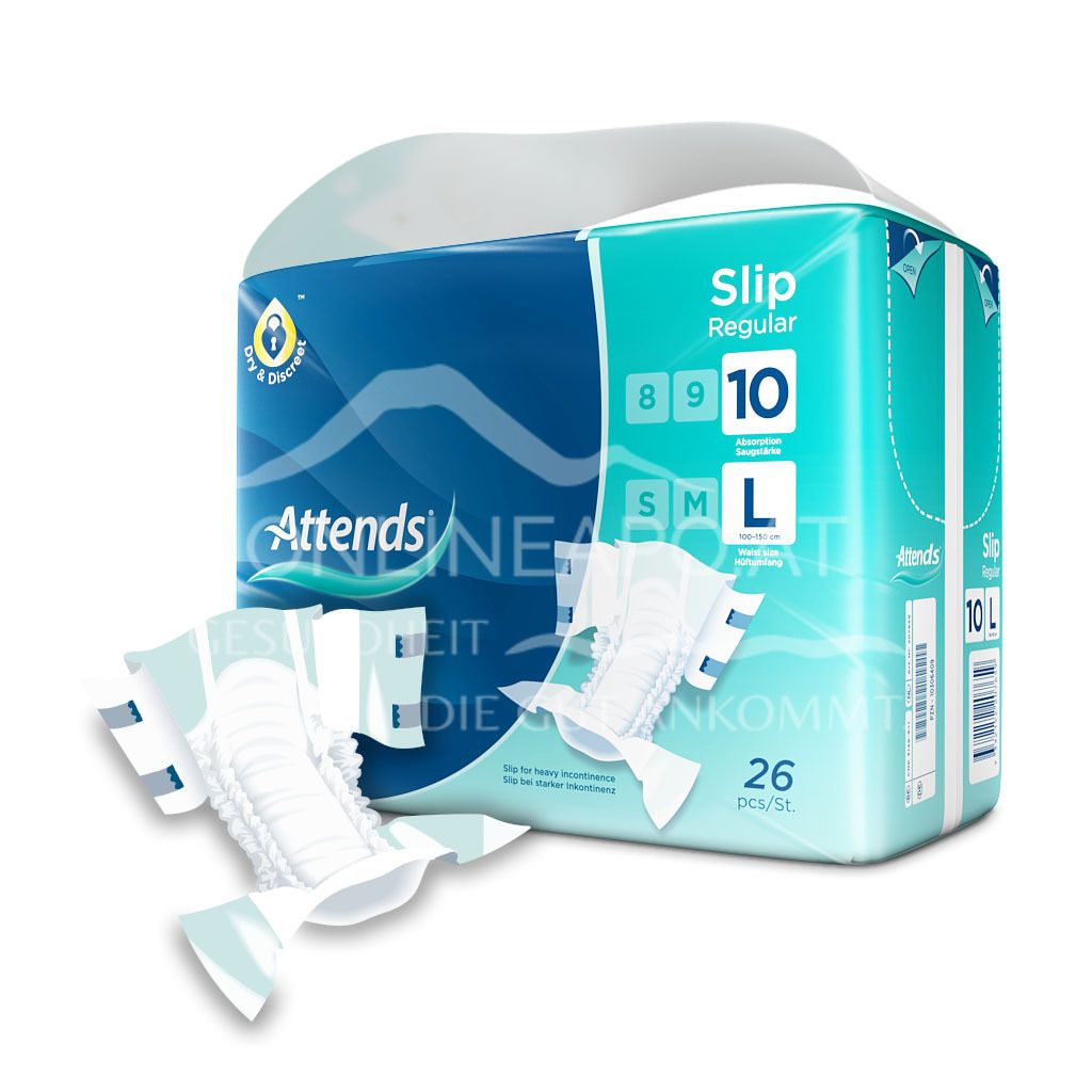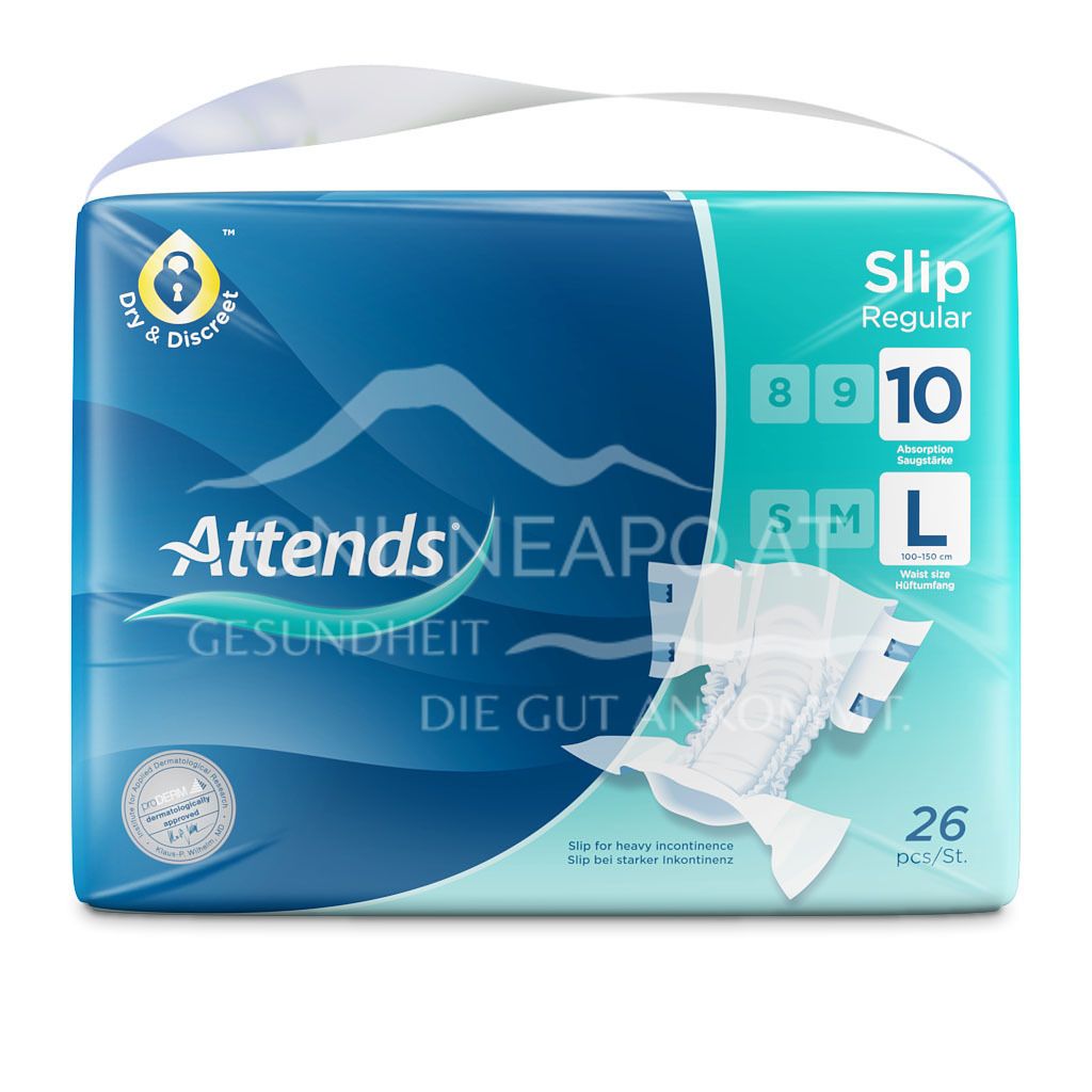 Die Attends Slip Regular 10 L sind All-in-One-Produkte und bietet zuverlässigen Schutz bei starker Harn- und/oder Stuhlinkontinenz. Atmungsaktiv, hautfreundlich und diskret.