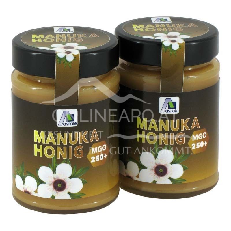 Avitale Manuka Honig aus Neuseeland mit mindestens 250 mg Methylglyoxal (MGO) pro Kilogramm Honig. Ein reines Naturprodukt aus dem Blütennektar des neuseeländischen Manuka-Baumes mit dem natürlichen Inhaltsstoff Methylglyoxal (MGO).