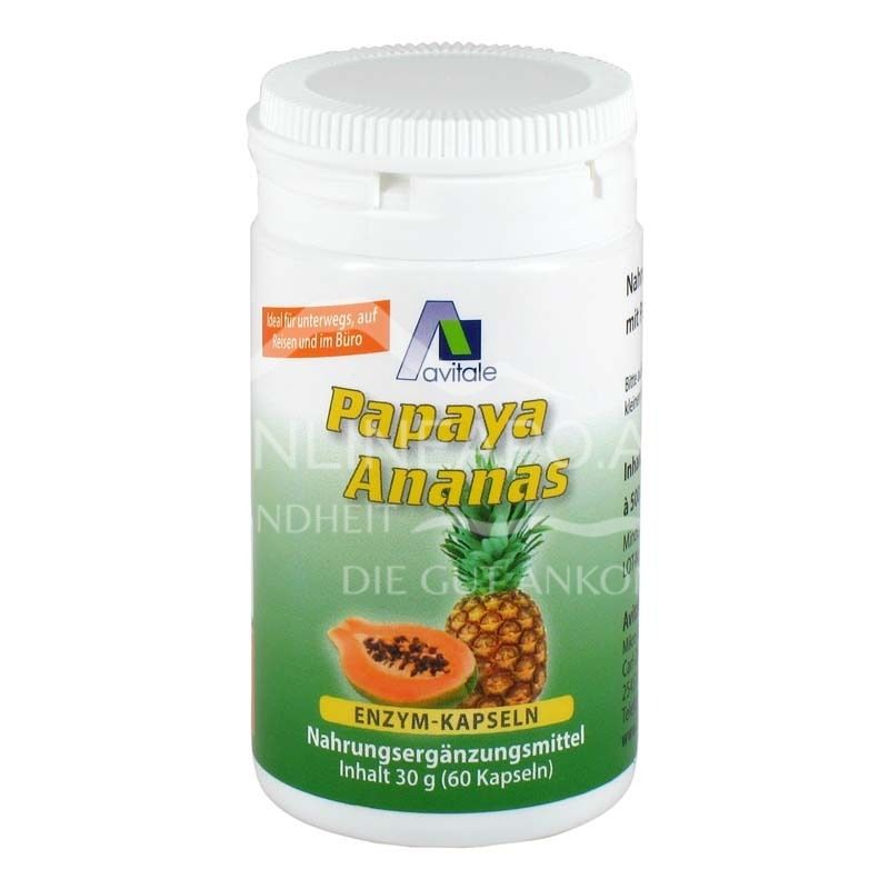 Die Avitale Papaya-Ananas Enzym Kapseln sind ein Nahrungsergänzungsmittel mit den Enzymen Papain und Bromelain. Das Enzym Bromelain wird aus der Ananas gewonnen, dass Enzym Papain aus der Papaya.