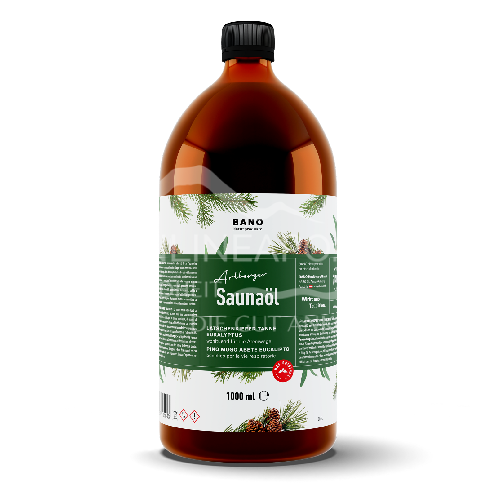 BANO Arlberger Saunaöl hergestellt aus reinen Ölen und Extrakten, mit Latschenkiefer, Tanne und Eukalyptus.