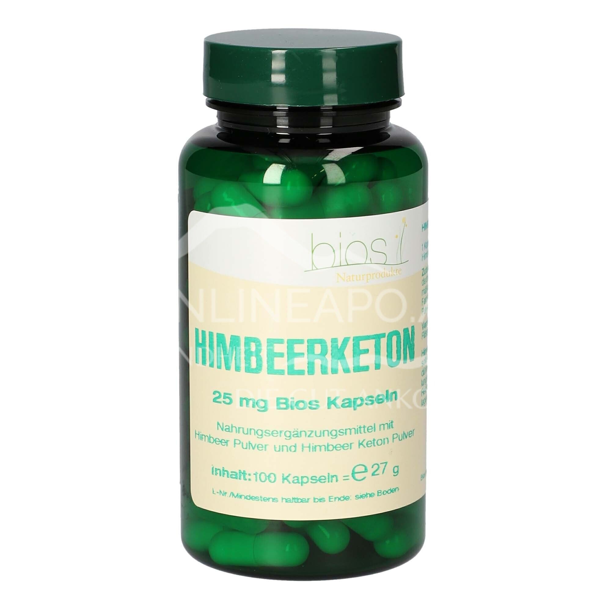 Die Bios Himbeerketon 25 mg Kapseln sind ein Nahrungsergänzungsmittel mit Himbeer Pulver und Himbeer Keton Pulver. Himbeerketon wird auch Rheosmin genannt.