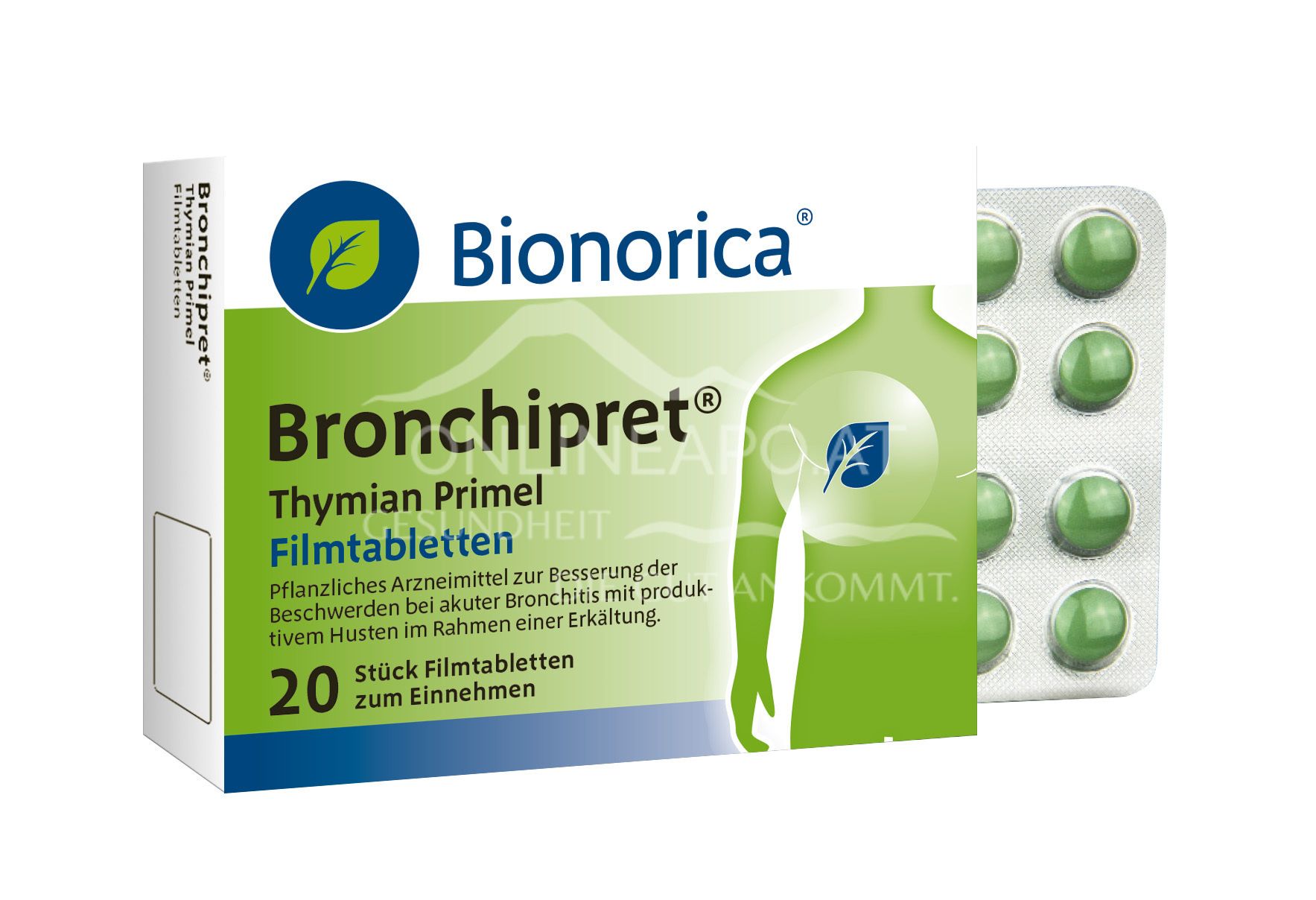 - 1 Filmtablette Bronchipret Thymian Primel enthält: 160 mg Trockenextrakt aus Thymiankraut (Verhältnis Droge:Extrakt 6-10:1, Auszugsmittel: Ethanol 70 Vol.%), 60 mg Trockenextrakt aus Primelwurzel (Verhältnis Droge:Extrakt 6-7:1, Auszugsmittel: Ethanol 47,4 Vol.%)