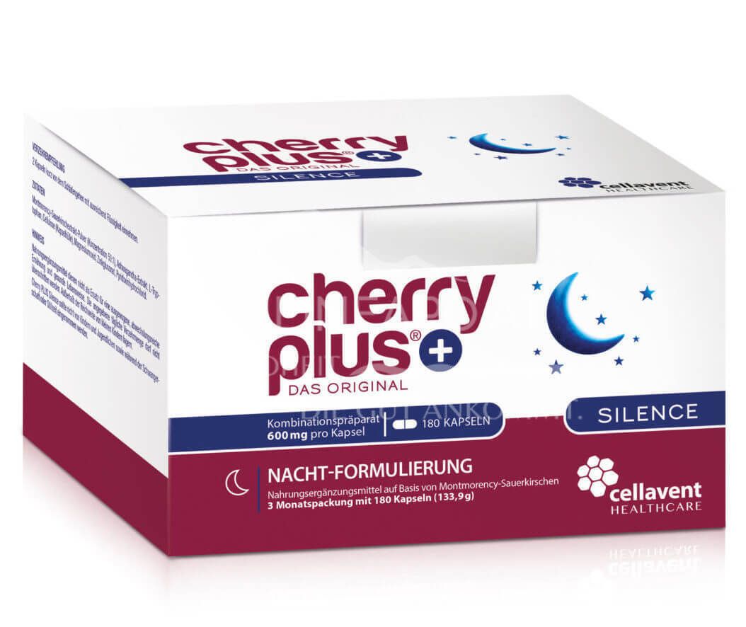 - Guter Schlaf ist nicht immer eine Selbstverständlichkeit. Stress, Sorgen und Ängste verursachen häufig innere Unruhe. Aus dem Grund haben wir Cherry PLUS Silence entwickelt: Eine ausgewählte Kombination aus der Montmorency-Sauerkirsche, einem Extrakt aus der Ashwagandha (Schlafbeere), dem Eiweißbaustein L‑Tryptophan sowie Magnesium, Zink und Vitamin B6. Mit dieser natürlichen Verbindung kann Cherry PLUS Silence dazu beitragen, dass mehr innere Ruhe, Ausgeglichenheit und Leistungsfähigkeit zurückkehren.