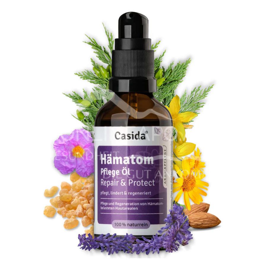 Das Casida® Hämatom Pflege Öl Repair & Protect dient als Einreibung zur Pflege strapazierter Haut aus 100 % naturreinen Ölen. Pflege und Regeneration von Hämatombelasteten Hautarealen. Pflegt, lindert und regeneriert.