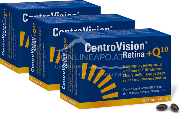 Die CentroVision® Retina + Q10 Kapseln sind ein Nahrungsergänzungsmittel mit Coenzym Q10, Vitaminen, Mineralstoffen, Omega-3-Fettsäuren und Pflanzenextrakten. Vitamin A und Vitamin B2 tragen zur Erhaltung der normalen Sehkraft bei.