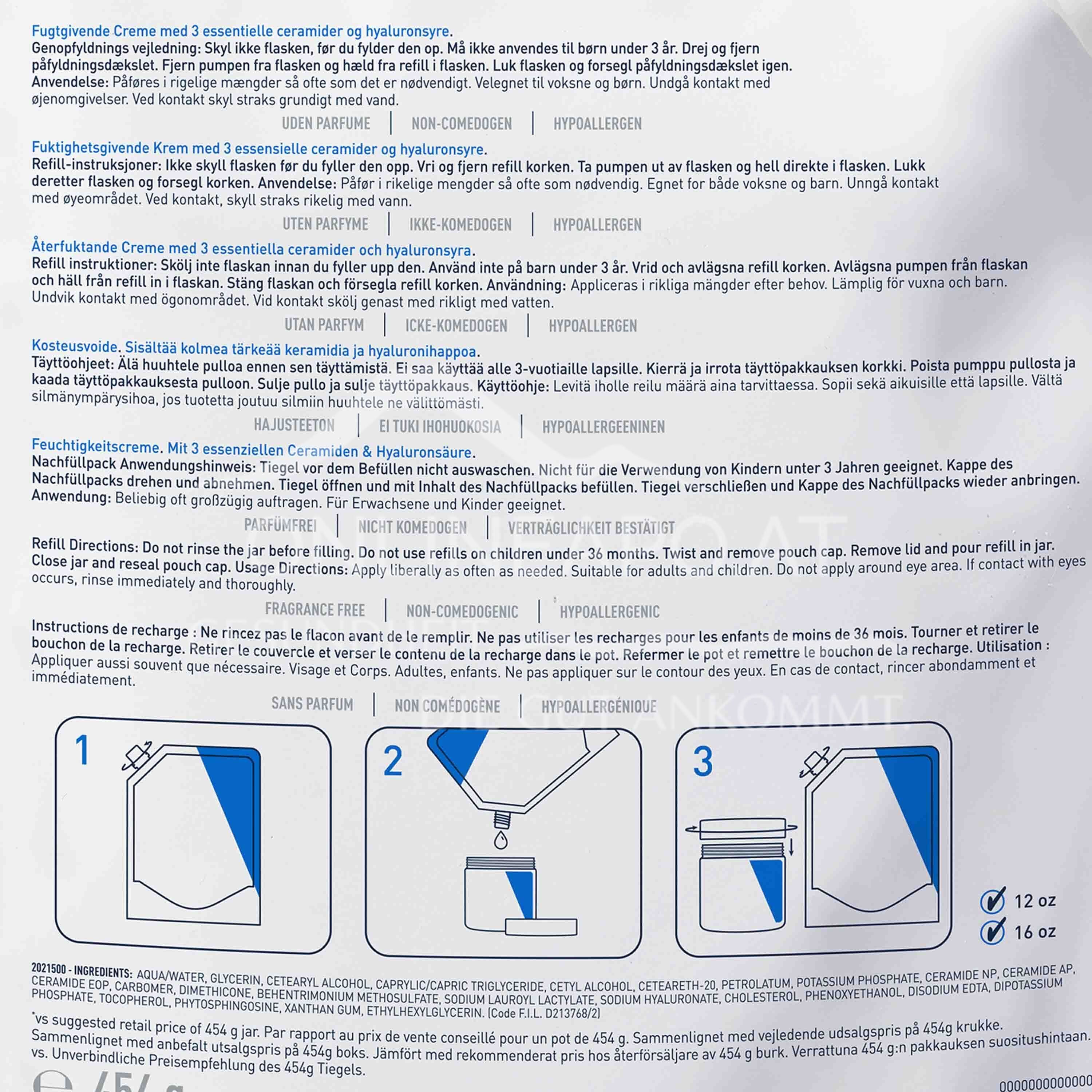 Zusammensetzung: AQUA/WATER, GLYCERIN, CETEARYL ALCOHOL, CAPRYLIC/CAPRIC TRIGLYCERIDE, CETYL ALCOHOL, CETEARETH-20, PETROLATUM, DIMETHICONE, PHENOXYETHANOL, BEHENTRIMONIUM METHOSULFATE, POTASSIUM PHOSPHATE, ETHYLHEXYLGLYCERIN, SODIUM LAUROYL LACTYLATE, DISODIUM EDTA, DIPOTASSIUM PHOSPHATE, CERAMIDE NP, CERAMIDE AP, PHYTOSPHINGOSINE, CHOLESTEROL, XANTHAN GUM, CARBOMER, SODIUM HYALURONATE, TOCOPHEROL, CERAMIDE EOP.
