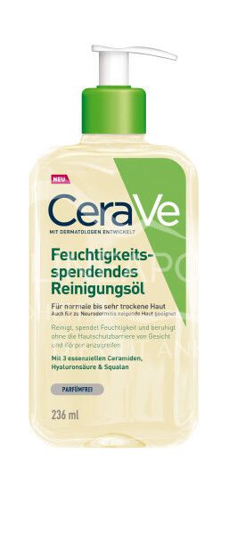 Das Feuchtigkeitsspendende Reinigungsöl von CeraVe wurde in Zusammenarbeit mit Dermatologen entwickelt. Die einzigartige, schäumende Formel reinigt die Haut sanft und wirkt beruhigend. Make-up wird schonend entfernt, ohne die Haut zu reizen. Das Reinigungsöl mit Ceramiden, Squalan und Triglyceriden versorgt die Haut bereits während der Reinigung mit Feuchtigkeit und beugt Austrocknung vor – für eine gestärkte Hautschutzbarriere. Das CeraVe Feuchtigkeitsspendende Reinigungsöl ist auch für zu Allergien neigende Hauttypen, sehr trockene Haut, zu Neurodermitis neigende Haut sowie empfindliche Babyhaut geeignet, da die Formel ohne Parabene und Parfum auskommt.