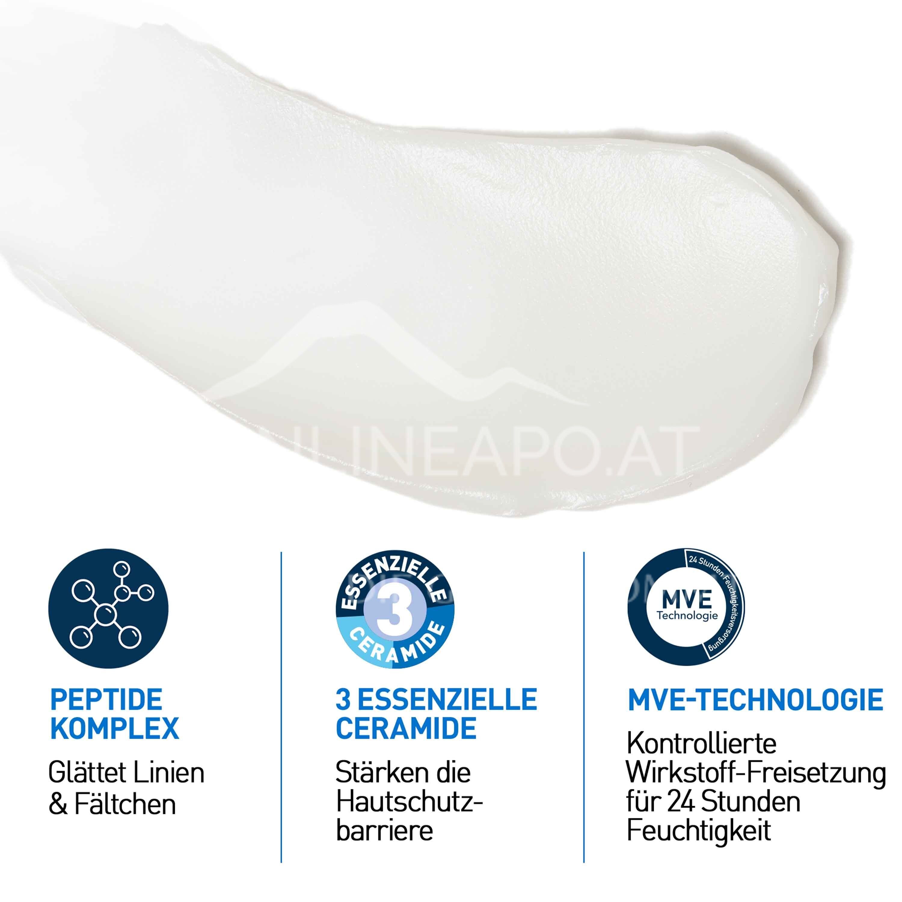 Reichhaltige Peptide-Creme für eine aufgepolstertere Haut von CeraVe Die Anti-Aging-Creme mit Peptid-Komplex von CeraVe polstert die Haut über Nacht sichtbar auf und verleiht am nächsten Morgen ein waches und verjüngtes Aussehen. Eine reichhaltige Nachtcreme geeignet für alle Hauttypen – für ein spürbar verbessertes Hautbild. Sanfter Wirkstoffkomplex gegen müde aussehende Haut Der Komplex aus biomimetischen Peptiden regt die Kollagenproduktion an, wodurch die Haut an Festigkeit und Elastizität gewinnt. Niacinamid beruhigt sanft die Haut, während Ceramide die natürliche Hautschutzbarriere regenerieren und stärken. Gleichzeitig versorgt Hyaluron die Haut bis zu 48 Stunden lang intensiv mit Feuchtigkeit.