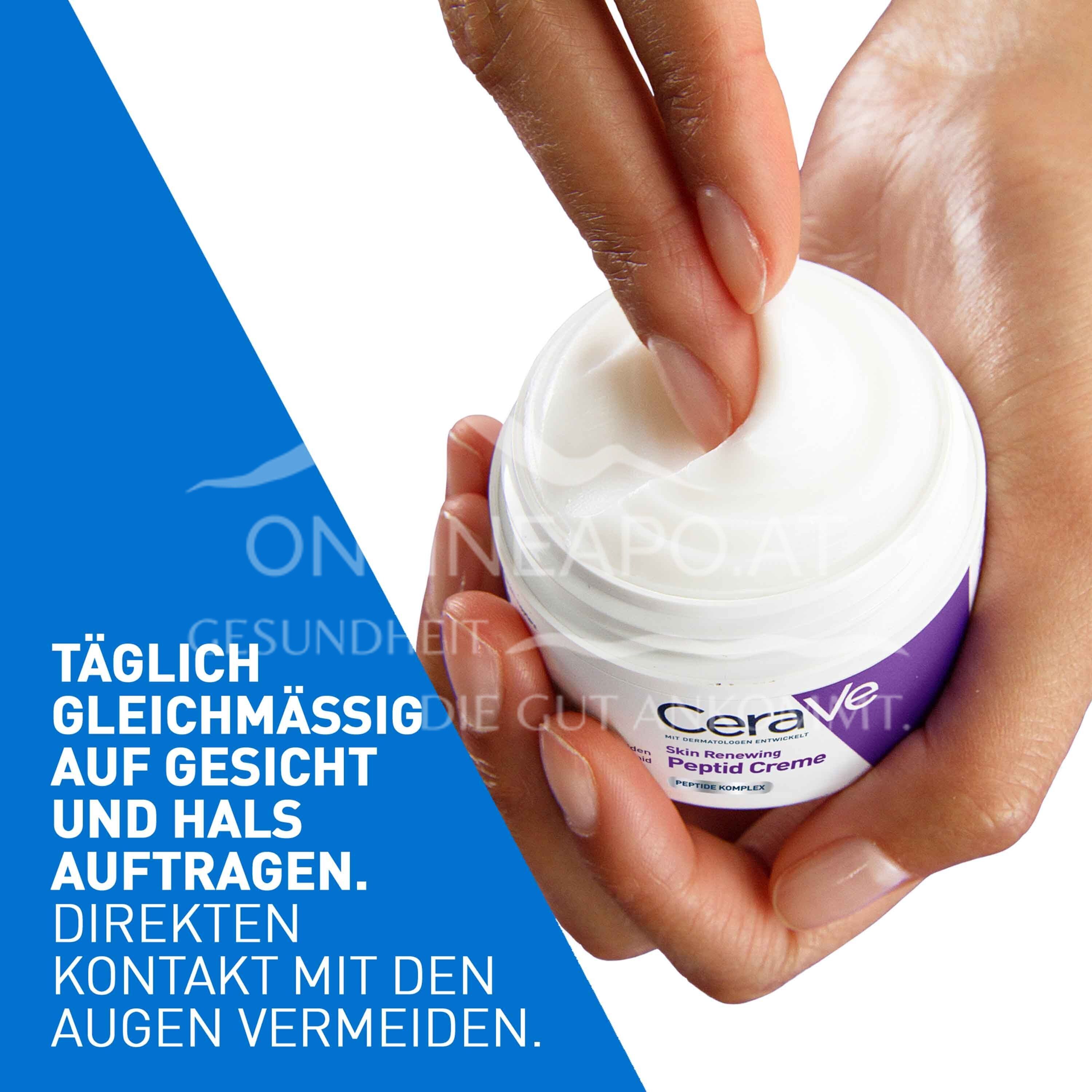 - Die CeraVe Skin Renewing Peptid Creme täglich nach der abendlichen Gesichtsreinigung auf die Fingerspitze geben und gleichmäßig in kleinen Punkten auf Gesicht und Hals auftragen. Anschließend sanft einmassieren, bis die Creme vollständig eingezogen ist. Die Augenpartie aussparen und bei Kontakt mit den Augen diese direkt ausspülen. Die mit Dermatologen entwickelte Anti-Aging-Creme hat eine leichte, nicht komedogene Formel ohne Duftstoffe und ist somit für alle Hauttypen geeignet.