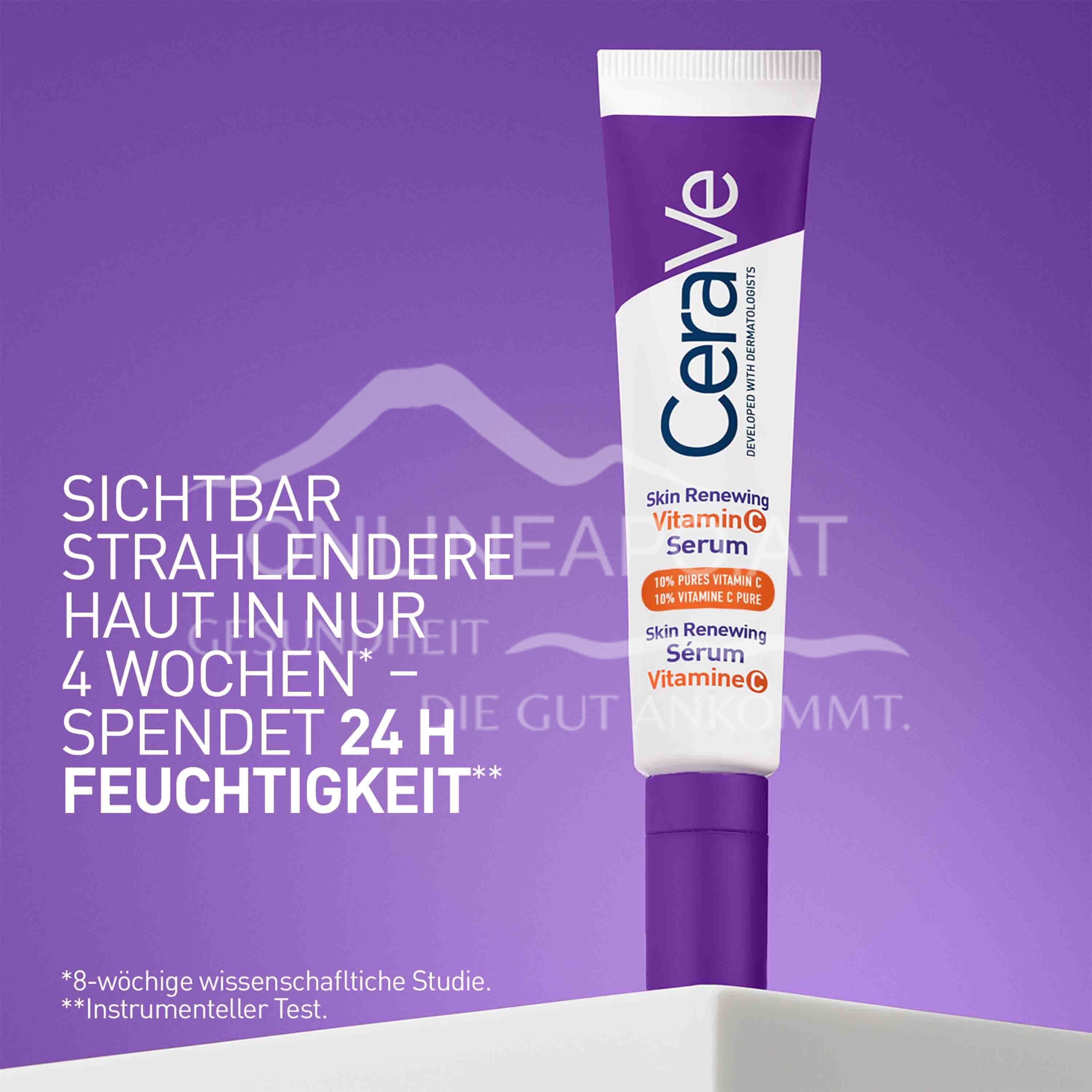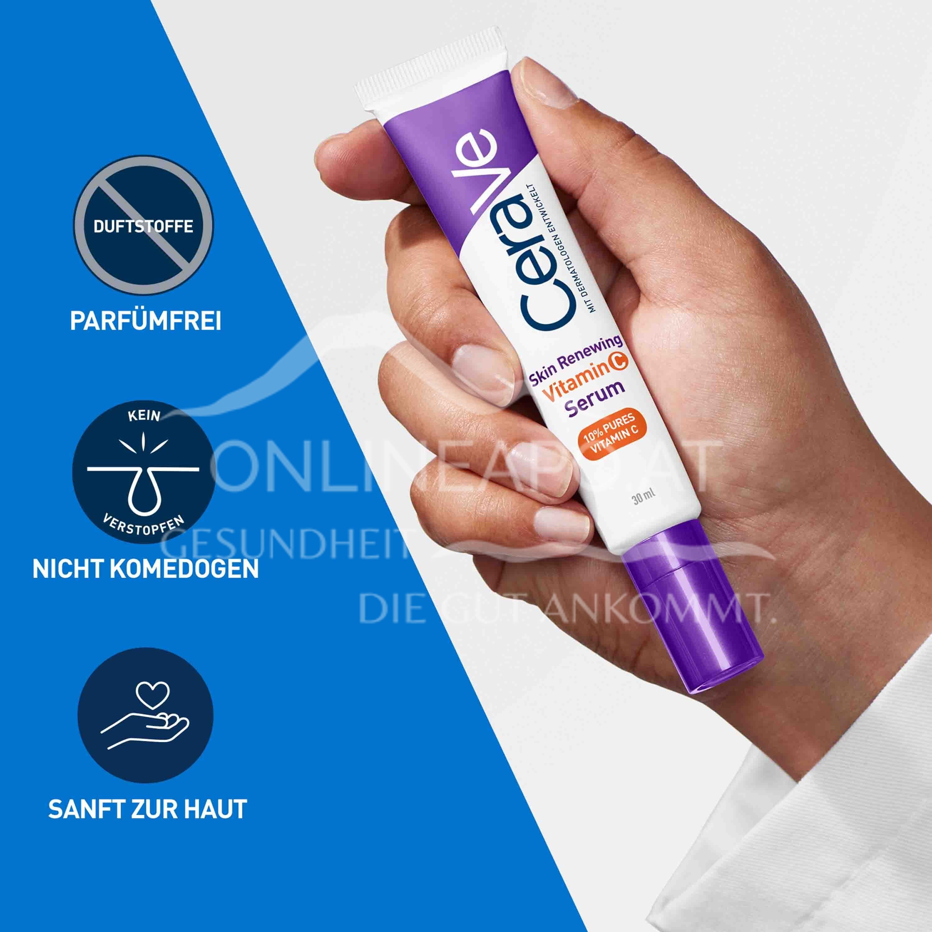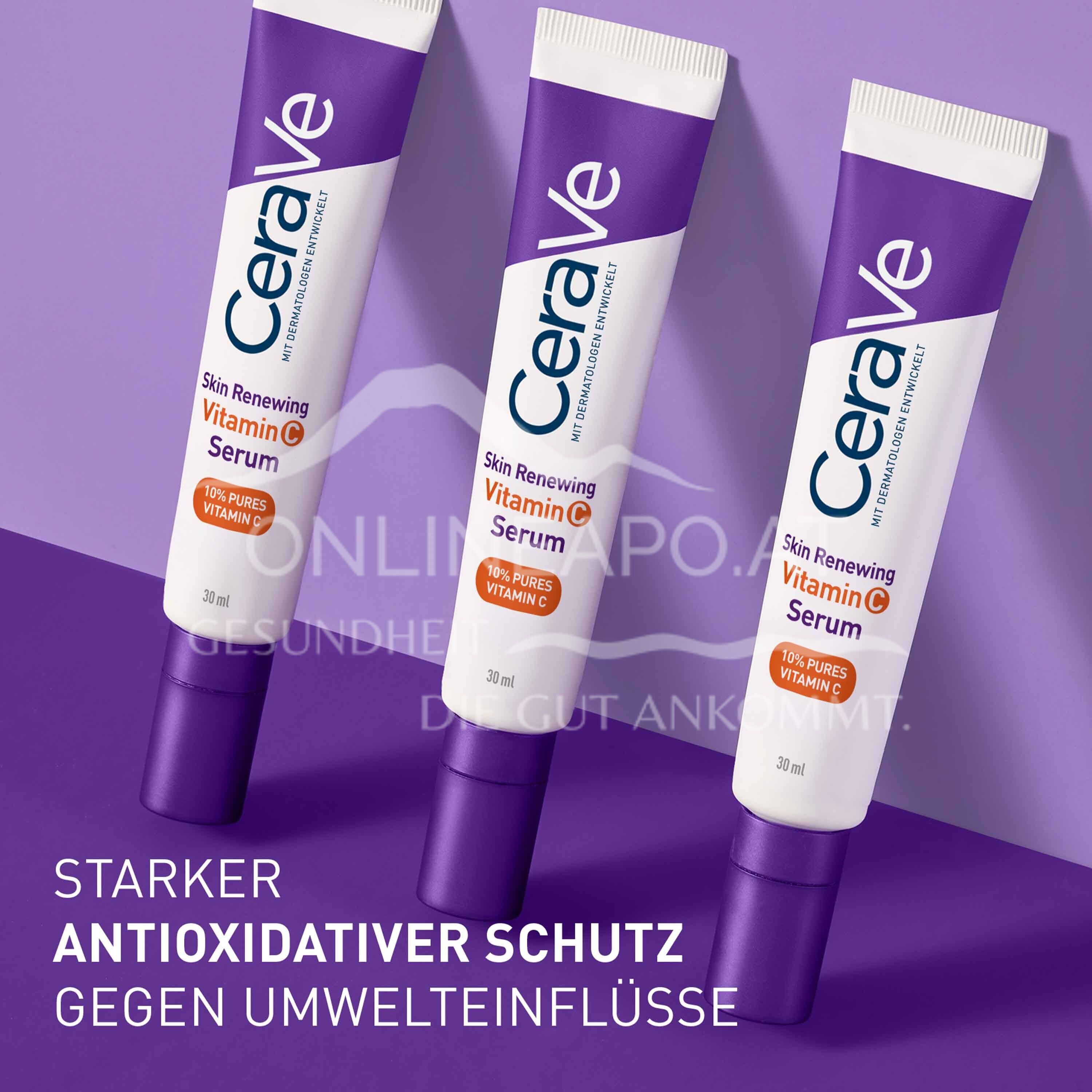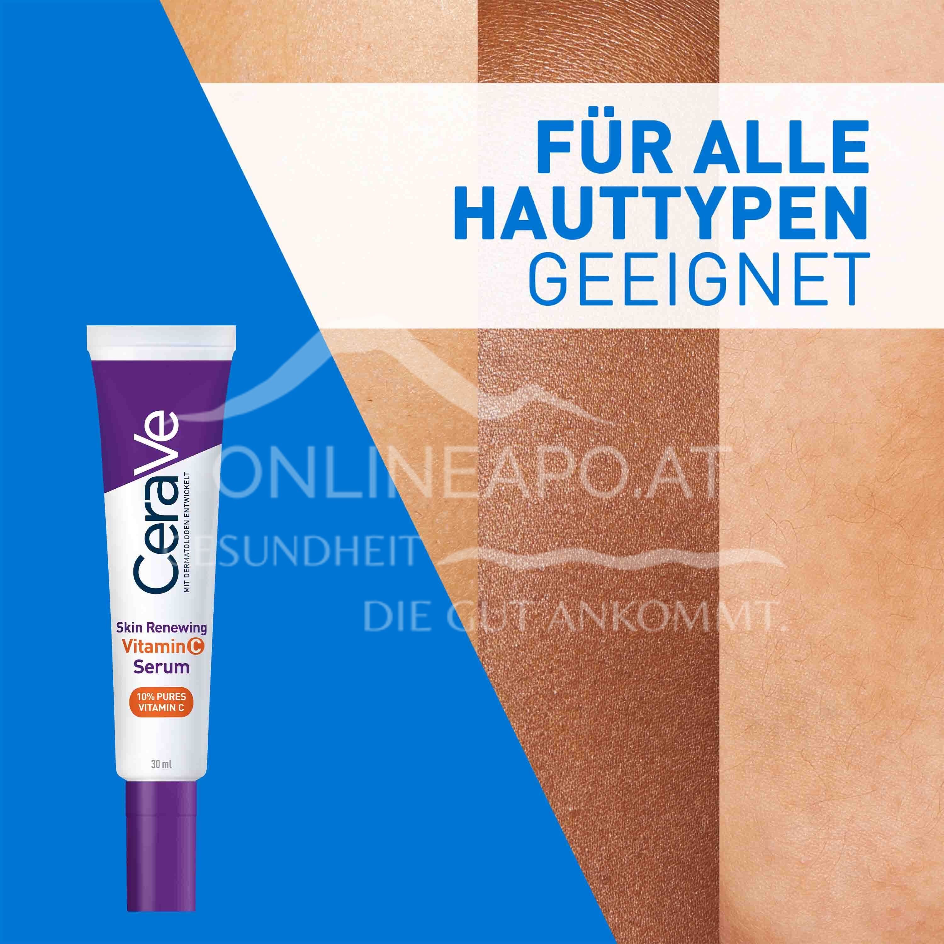 Das CeraVe Skin Renewing Vitamin C Serum mit 10% purem Vitamin C, Hyaluron, Ceramiden und Vitamin B5 mildert effektiv Pigmentflecken und Falten und sorgt für eine sichtbar strahlende Haut.