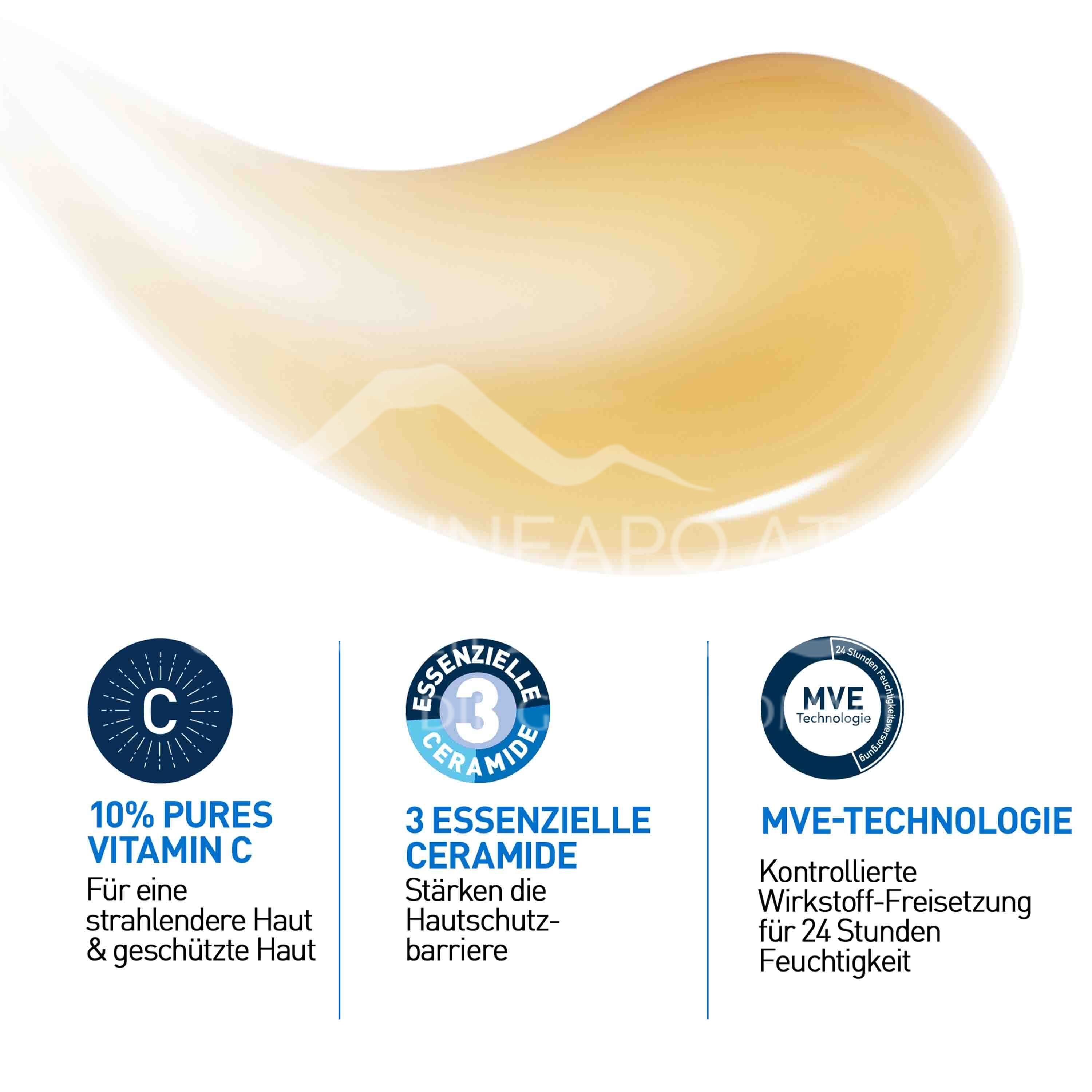Anti-Aging-Serum für reife Haut von CeraVe Das CeraVe Vitamin C Serum mit 10 % purem Vitamin C, Vitamin B5, Hyaluron und den drei essenziellen Ceramiden 1, 3 und 6-II wirkt sichtbar Anzeichen der Hautalterung wie Falten, Pigmentflecken und Hautunebenheiten entgegen – für eine ebenmäßigere, strahlendere Haut. Antioxidativer Wirkstoffkomplex mit sanfter Formulierung Die nicht komedogene Formel kommt ganz ohne Duftstoffe und Parabene aus und hat eine ultra-leichte Textur, die schnell einzieht und nicht klebt. Das Vitamin-Duo aus purem Vitamin C und Vitamin B5 mildert effektiv Falten, Pigmentflecken und unebene Haut. Gleichzeitig spenden Hyaluron und Ceramide der Haut intensive Feuchtigkeit.