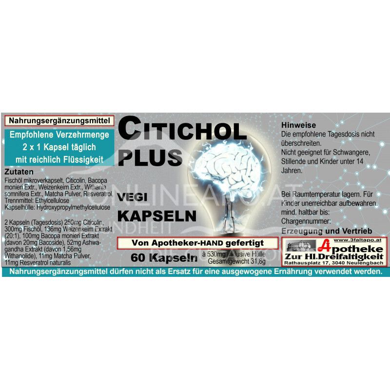 Die Citichol Plus Vegi Kapseln sind ein Nahrungsergänzungsmittel mit Citicolin, die Vorstufe vom Botenstoff Phospatidylcholin, unterstützt die Leistungsfähigkeit der Gehirnzellen!