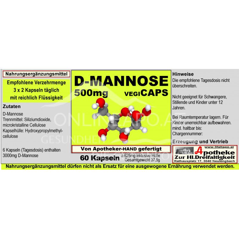 - Zutaten: D-Mannose, Trennmittel: Siliziumdioxide, mikrokristalline Cellulose, Kapselhülle: Hydroxypropylmethylcellulose.