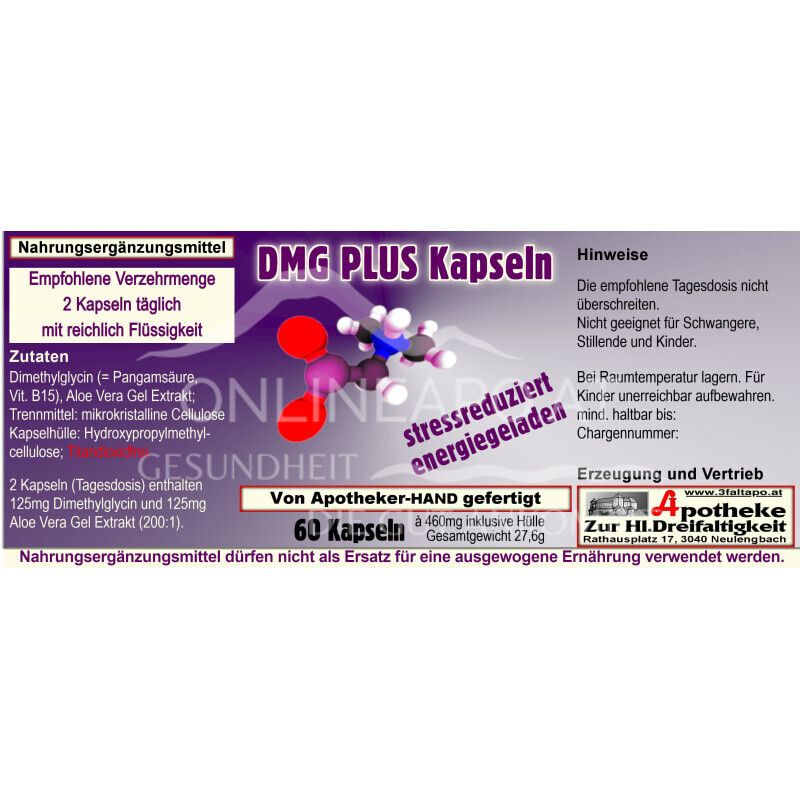 Die DMG Plus Kapseln sind ein Nahrungsergänzungsmittel mit Dimethylglycin (= Pangamsäure, Vitamin B15) und Aloe Vera Gelextrakt. Der Aminosäure Dimethylglycin (DMG) werden eine Vielzahl an Wirkungen zugschrieben.