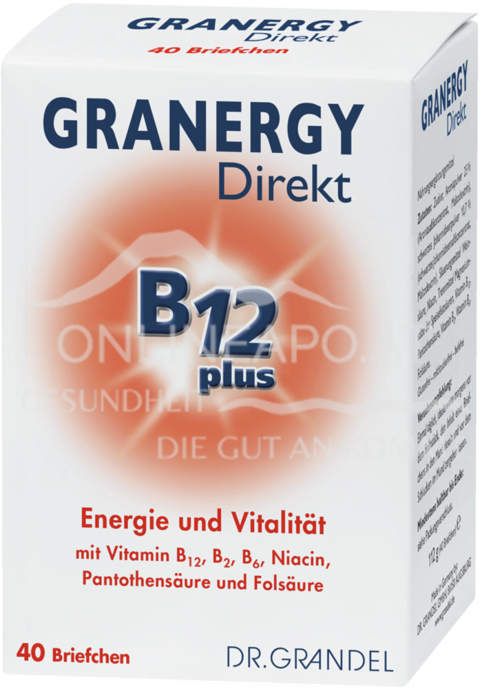 - Vitamin B12 ist für die Leistungsfähigkeit und Vitalität unentbehrlich. Es ist am Energiestoffwechsel beteiligt und sorgt unter anderem dafür, dass die Energie aus der Nahrung in körpereigene Energie umgewandelt werden kann. In Granergy Direkt ist Vitamin B12 mit weiteren ausgewählten Vitaminen kombiniert.