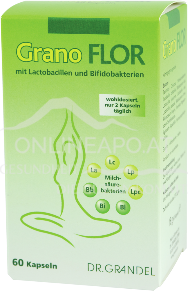 Granoflor enthält eine Mischung aus ausgewählten Lactobacillen und Bifidobakterien, die auch in einer normalen Darmflora zu finden sind. Diese Kulturen können neben einer ausgewogenen Ernährung zu einem guten Bauchgefühl beitragen und somit das allgemeine Wohlbefinden unterstützen. Granoflor Kapseln haben sich zur Unterstützung des allgemeinen Wohlbefindens seit vielen Jahren sehr bewährt.
