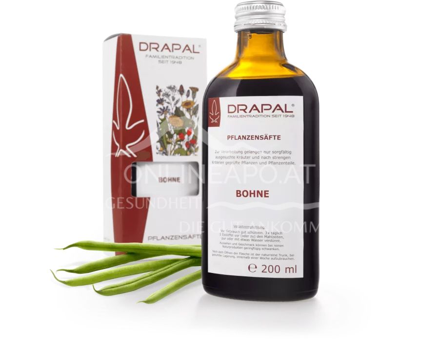 DRAPAL Pflanzensäfte - mit der Kraft der Natur. Sortenrein und wirksam. Bohne wirkt mit Gewebeentwässerung bei Herz- und Nierenerkrankungen. Besitzt eine leicht blutzuckersenkende Wirkung und kann zur Senkung des Körpergewichts beitragen.