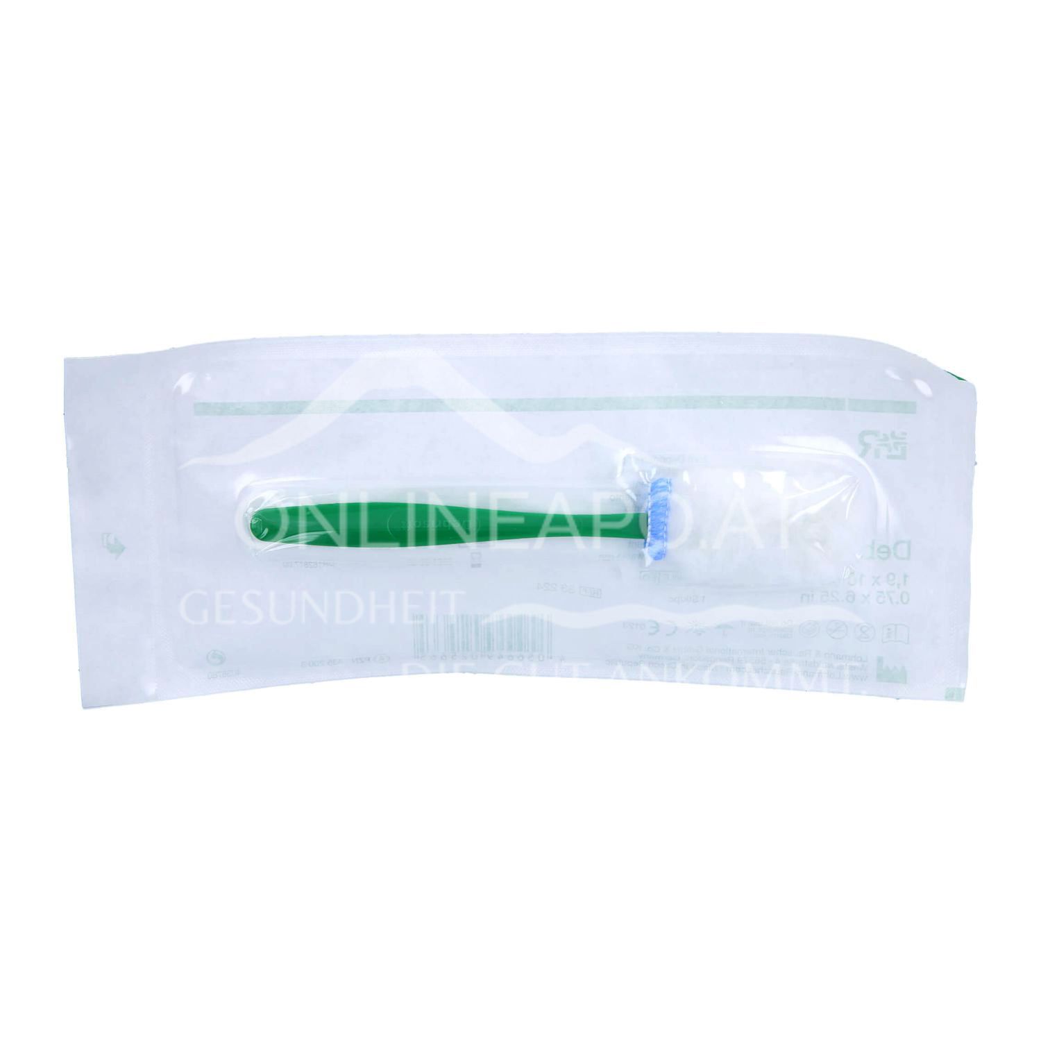 Zusammensetzung: Der Kopf des Debrisoft Lolly besteht aus Monofilament-Polyester-Fasern und ist umnäht mit einem blauen Röntgenkontrastfaden aus Polypropylen (enthält Bariumsulfat und Polyester). Die Innenseite des Kopfes ist beschichtet mit Polyacrylat. Der Kopf ist vernäht mit einem Griff aus Polypropylen.
