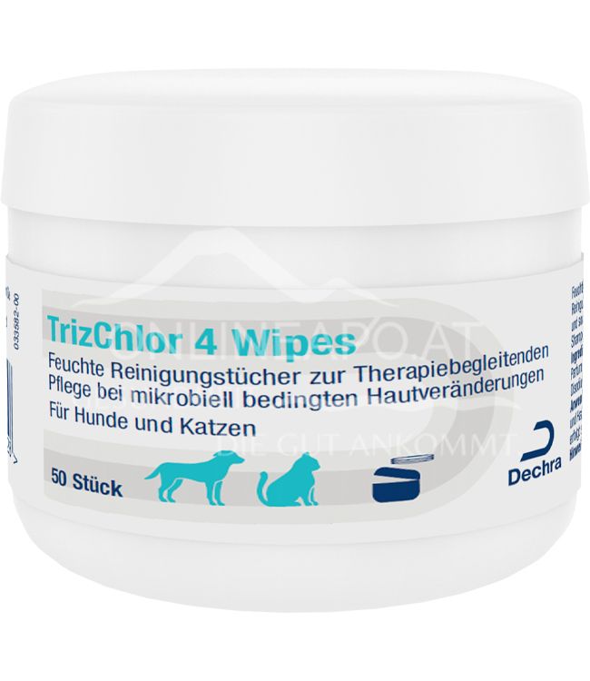Die Dechra TrizChlor 4 Wipes sind feuchte Reinigungstücher zur therapiebegleitenden Pflege bei mikrobiell bedingten Hautveränderungen bei Hunde und Katzen.