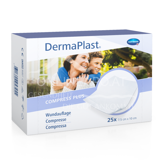 Die DermaPlast® Compress Plus ist eine saugstarke Wundkompresse aus weichem Vlies, die ideal für die Abdeckung von Schürf-, Schnitt- und Risswunden geeignet ist. Die perforierte und beschichtete Folie minimiert ein Verkleben mit der Wund.