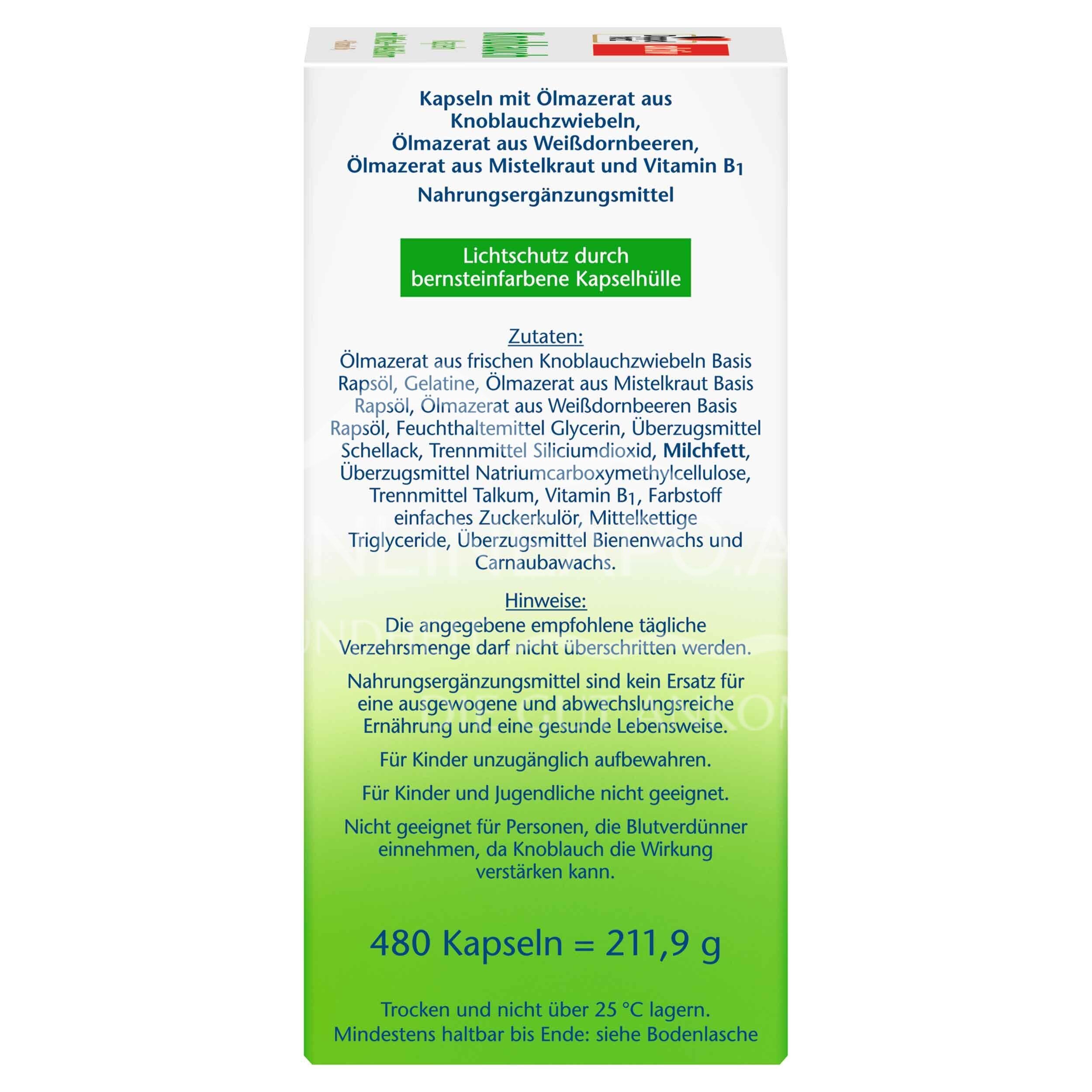 - Zusammensetzung pro Kapsel %NRV*: Ölmazerat aus frischen Knoblauchzwiebeln 60 mg **, Ölmazerat aus Mistelkraut 24 mg **, Ölmazerat aus Weißdornbeeren 54 mg **, Vitamin B1 1,1 mg 100 %. * Nährstoffbezugswerte gemäß EU-Verordnung 1169/2011. ** Keine Nährstoffbezugswerte vorhanden.