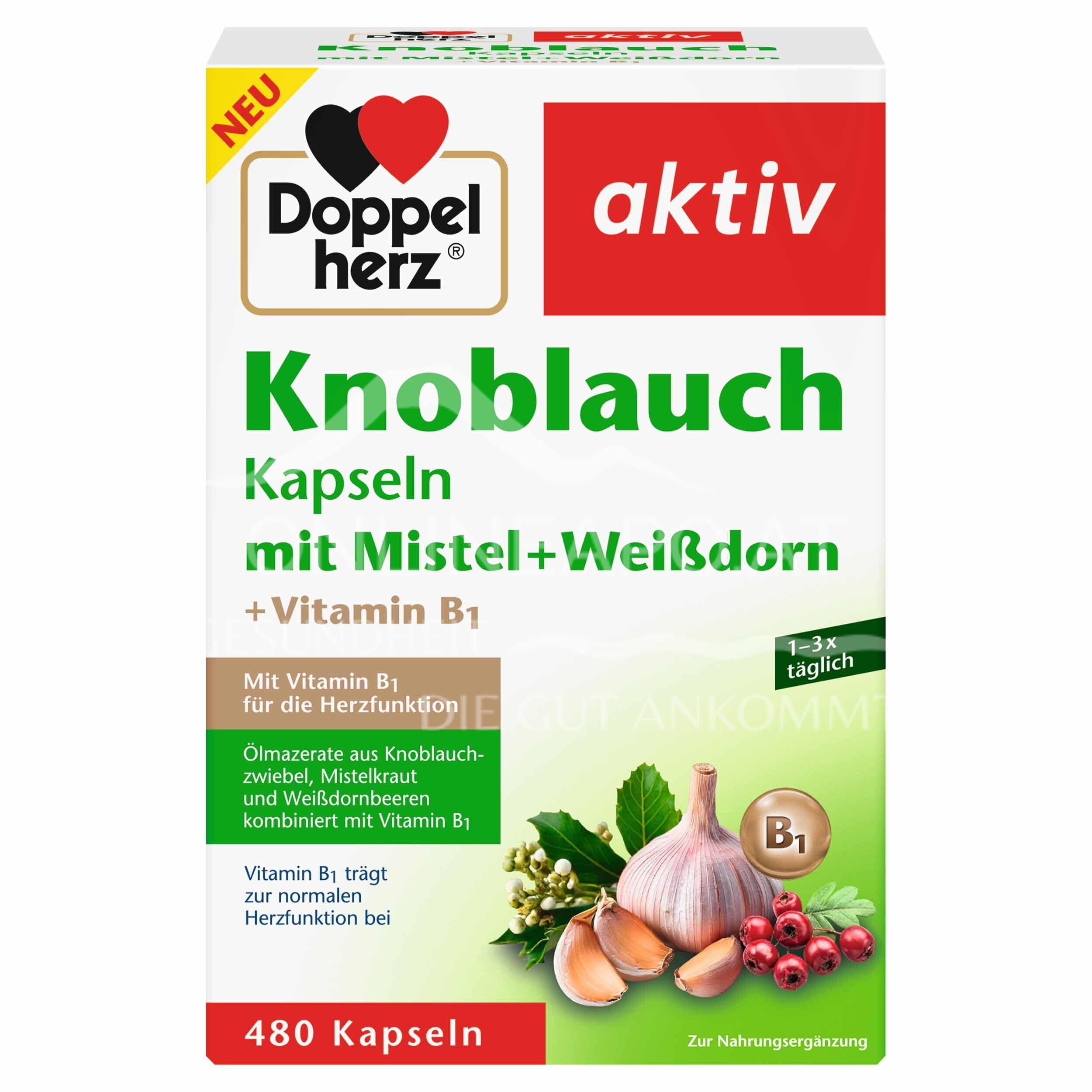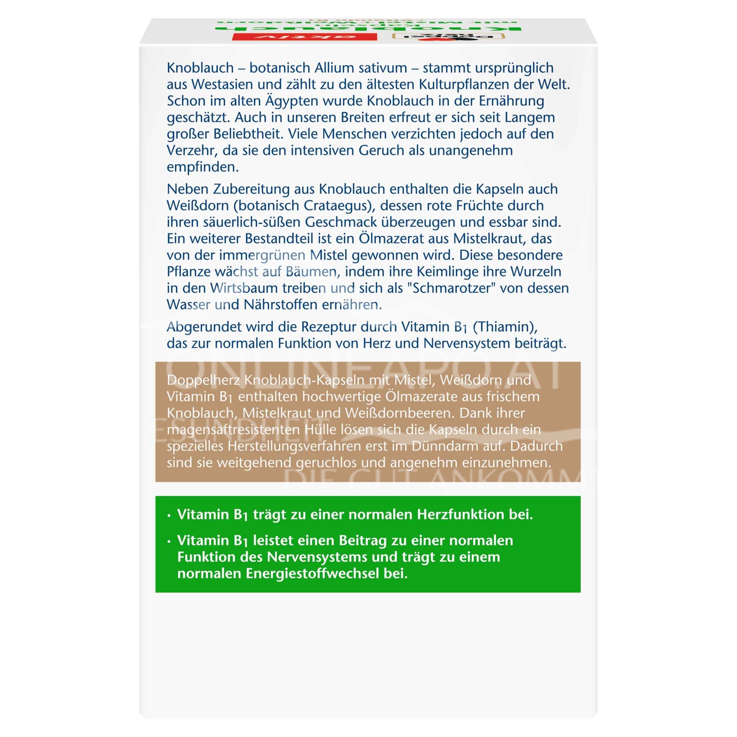 - Doppelherz Knoblauch Kapseln mit Mistel, Weißdorn und Vitamin B1 enthalten hochwertige Ölmazerate aus frischem Knoblauch, Mistelkraut und Weißdornbeeren.