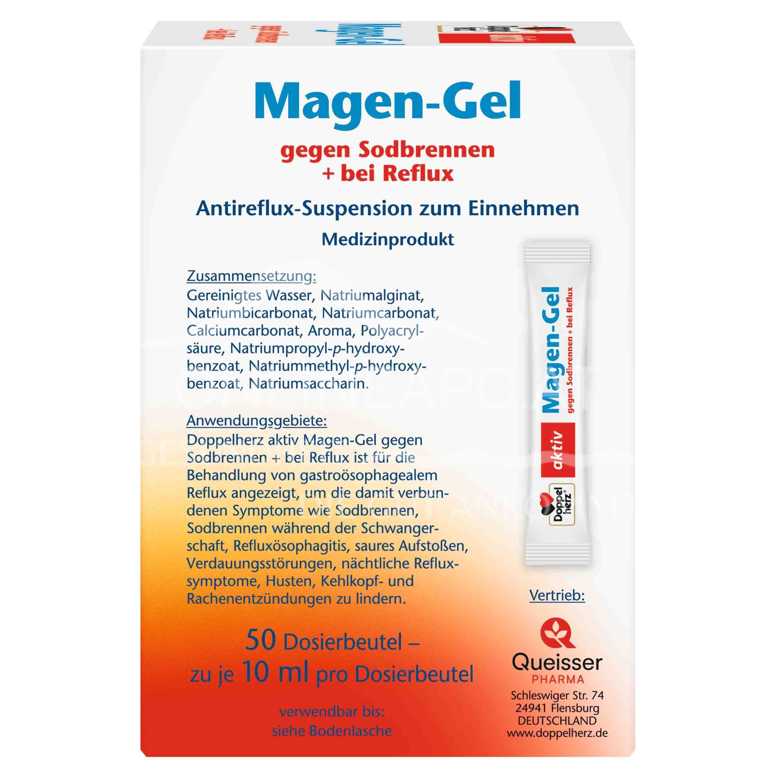 Doppelherz Magen-Gel wird eingesetzt zur Behandlung von gastroösophagealem Reflux zur Linderung der damit verbundenen Symptome wie Sodbrennen, Sodbrennen in der Schwangerschaft, Refluxösophagitis, saures Aufstoßen, Verdauungsbeschwerden, nächtliche Refluxsymptome, Husten und Kehlkopf-Rachen-Entzündung.
