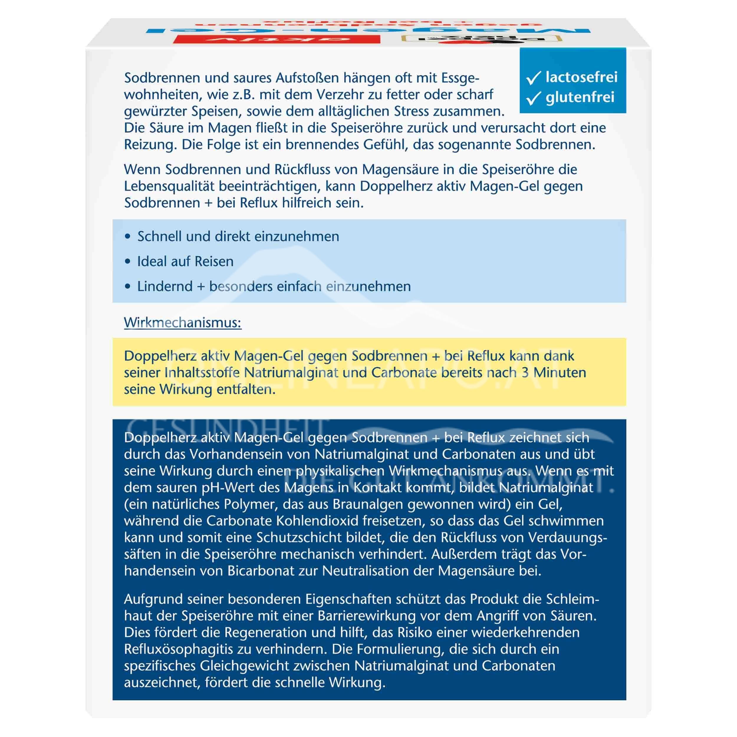 Die Doppelherz aktiv Magen-Gel Dosierbeutel sind ein Medizinprodukt. Doppelherz aktiv Magen-Gel gegen Sodbrennen + bei Reflux kann dank der Wirkung seiner Inhaltsstoffe Natriumalginat und Carbonate innerhalb von 3 Minuten zu wirken beginnen.