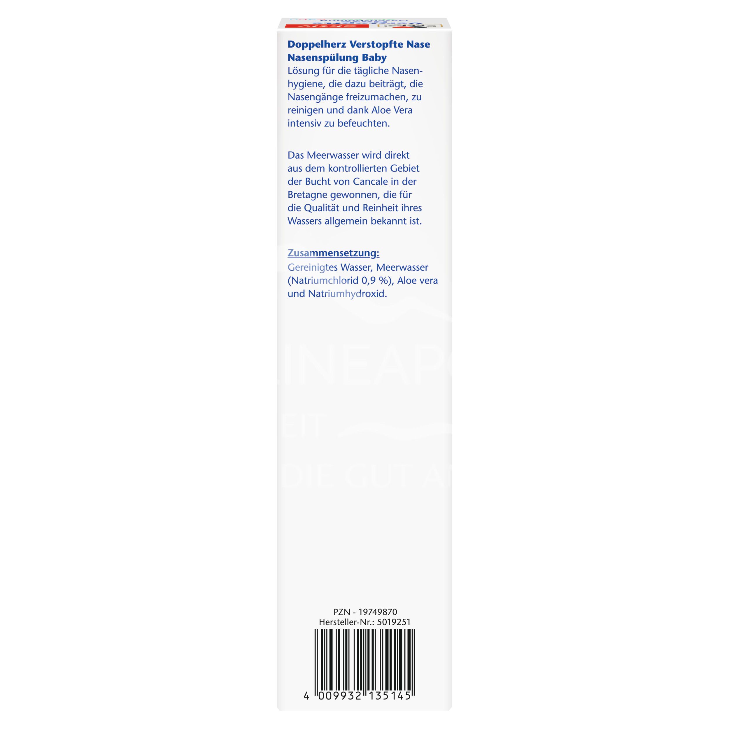 Doppelherz Verstopfte Nase Nasenspülung Baby ist ein treibgasfreies Nasenspray auf Basis einer isotonischen Meerwasserlösung (0,9 % Natriumchlorid) mit natürlichen Meeresmineralien und Spurenelementen sowie natürlichem Aloe-Vera-Extrakt.