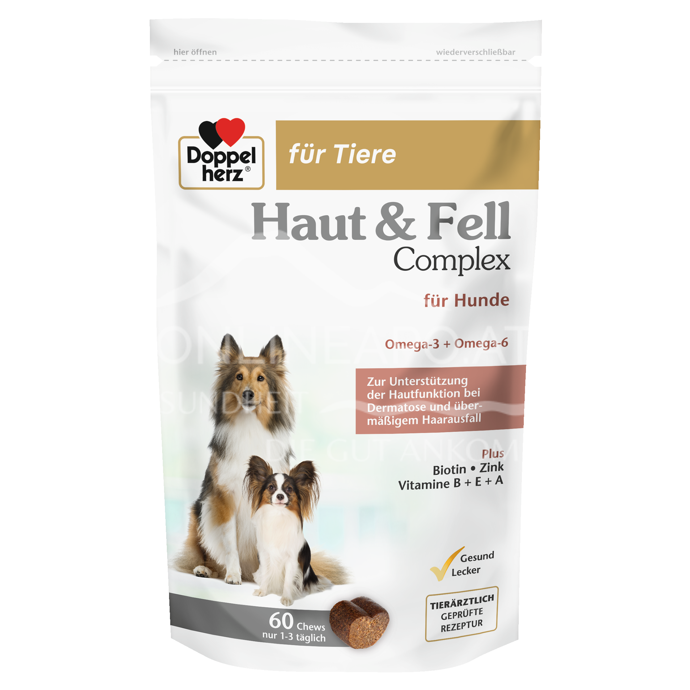 Gerade bei Erkrankungen der Haut (Überbegriff: Dermatosen) kann eine Futterergänzung sinnvoll sein und den Regenerationsprozess positiv beeinflussen. Doppelherz Haut & Fell Complex für Hunde enthält die wichtigen Nährstoffe, die Ihr Hund benötigt, wenn er mit Haut- und Fellproblemen zu kämpfen hat – und ebenso, um den Erhalt von glänzendem Fell und gesunder Haut zu unterstützen.