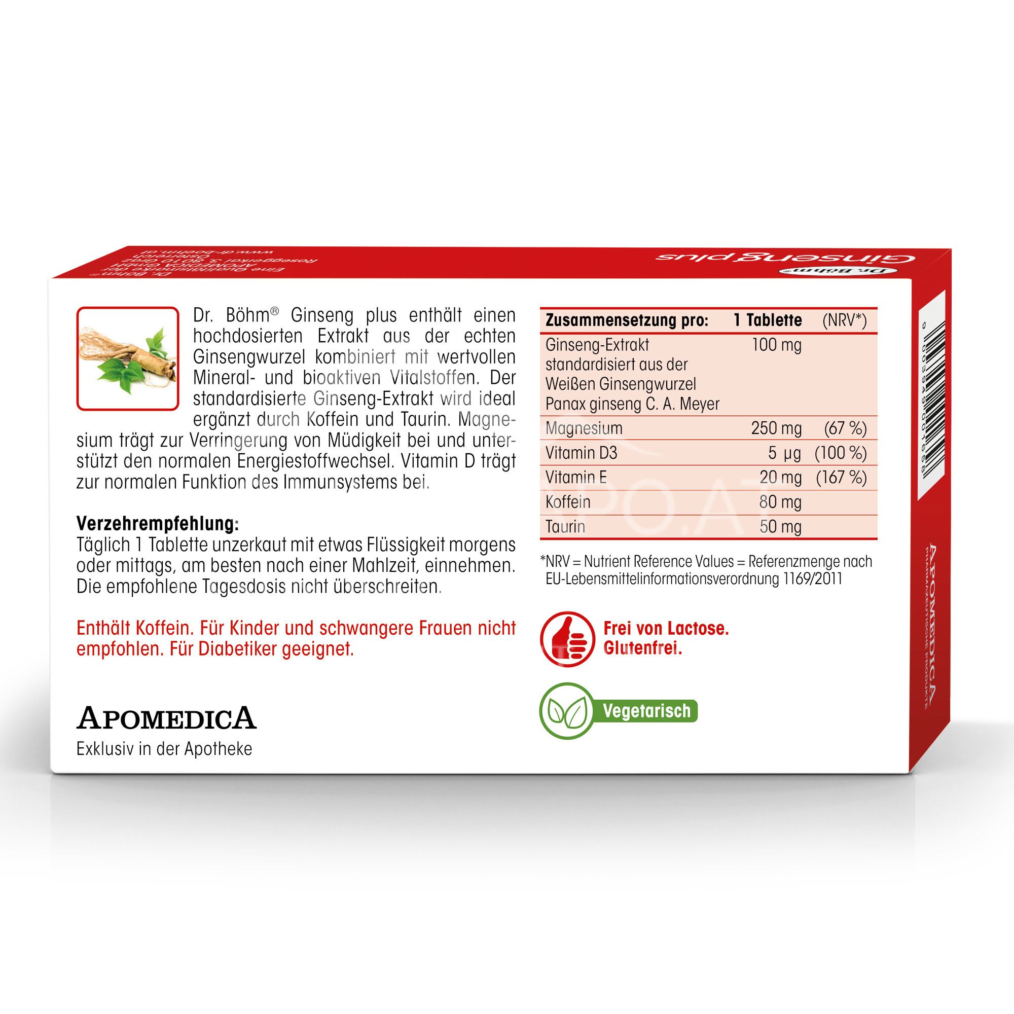 - Ginseng-Extrakt 100 mg (standardisiert aus der Weißen Ginsengwurzel Panax ginseng C. A. Meyer), Magnesium 250 mg, Vitamin D3 5,0 μg, Vitamin E 20 mg, Koffein 80 mg, Taurin 50 mg Frei von Lactose, Hefe, Gluten und Gelatine. Enthält Koffein.