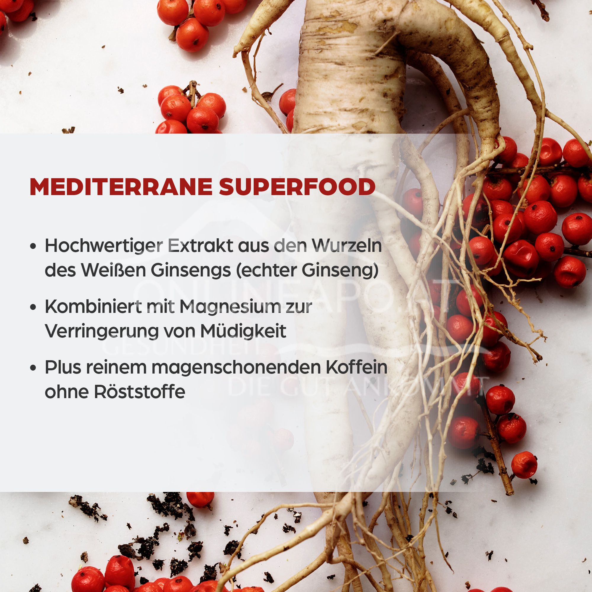 - Hochwertiger Extrakt aus den getrockneten Wurzeln des weißen (echten) Ginsengs