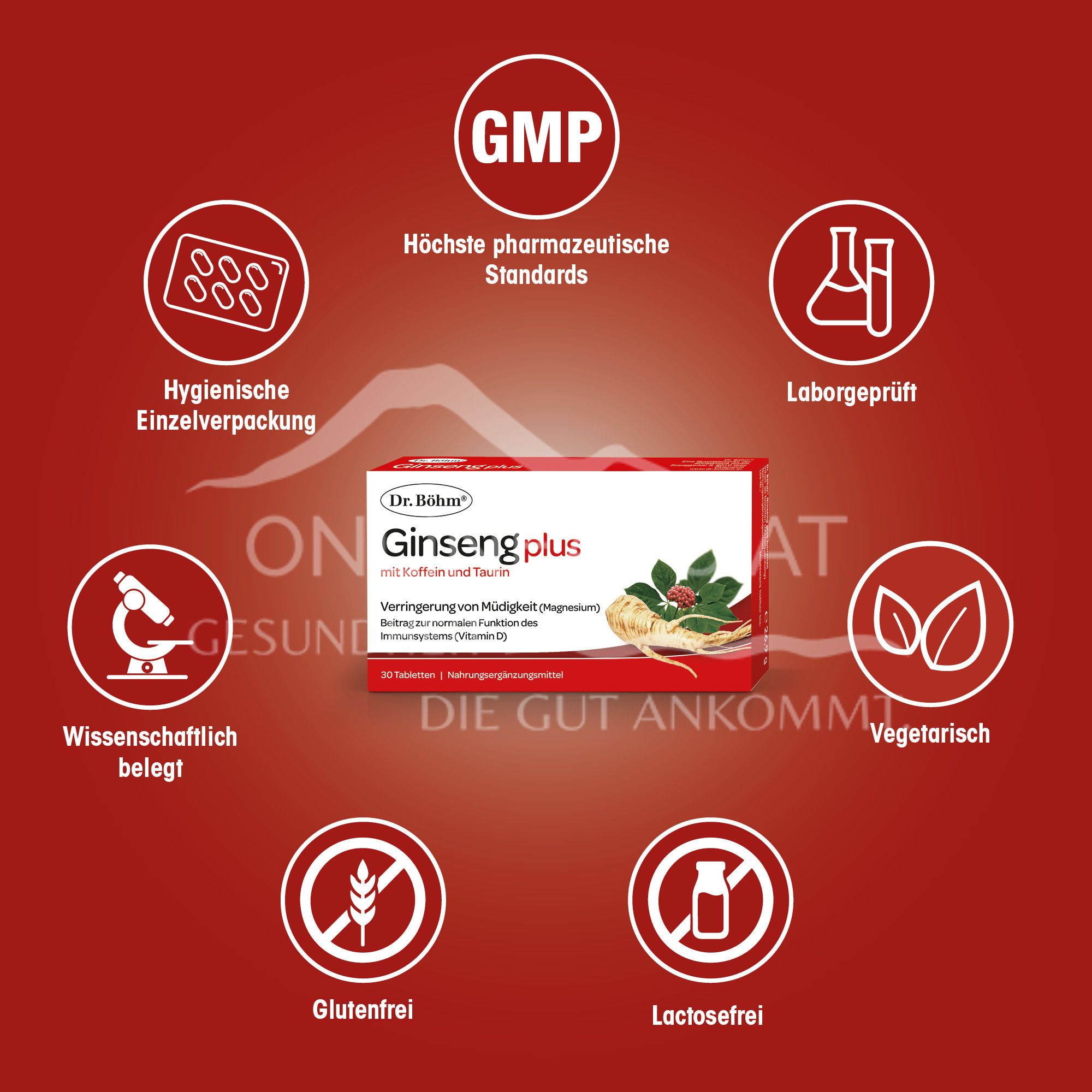 Dr. Böhm® Ginseng plus Tabletten sind ein Nahrungsergänzungsmittel zur Unterstützung für eine gesteigerte Konzentration und Vitalität! Plus Magnesium zur Verringerung von Müdigkeit.