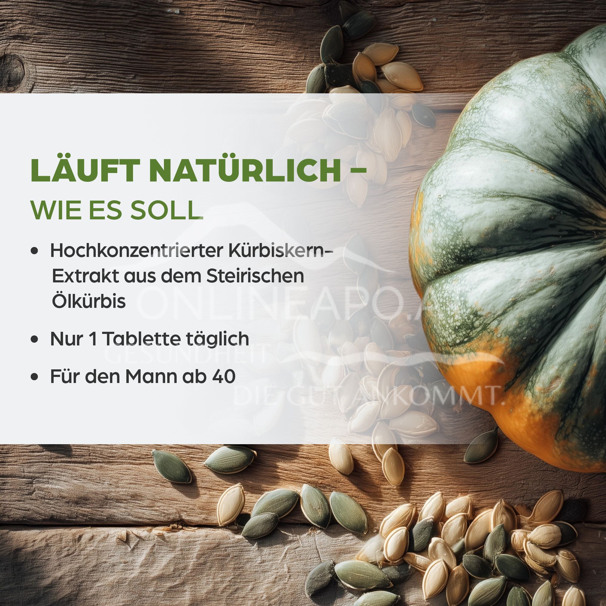 - 1 Tablette enthält: Extrakt aus steirischen Kürbiskernen 500 mg (Extr. sem. Cucurbitae peponis styriacae sicc. 20:1, entsprechend 10 g Kürbiskernen pro Tablette).