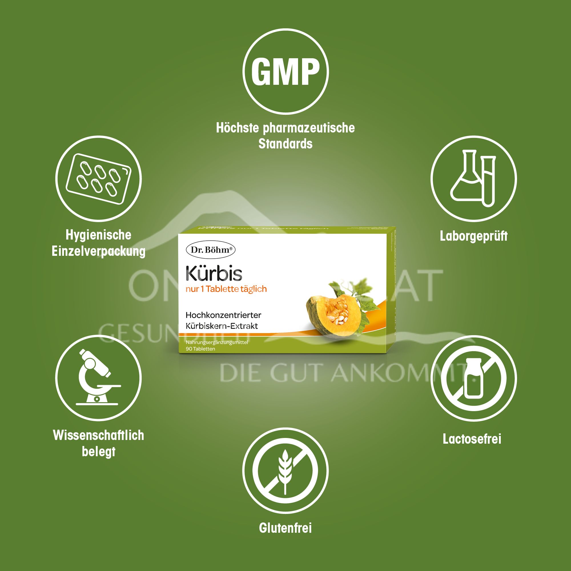 Dr. Böhm® Kürbis nur 1 x täglich unterstützt Ihre Blase und Prostata mit dem 20-fach-konzentrierten Extrakt aus steirischen Kürbiskernen und trägt so zu einem normalen Harnfluss bei. Bereits eine Tablette liefert Ihnen zur Prostataunterstützung die wertvollen Inhaltsstoffe von 10 g Kürbiskernen (entspricht 50 Kürbiskernen). Die beste Unterstützung für eine gesunde Prostata erzielen Sie, wenn Sie Dr. Böhm® Kürbis nur 1 x täglich über einen längeren Zeitraum hinweg einnehmen.