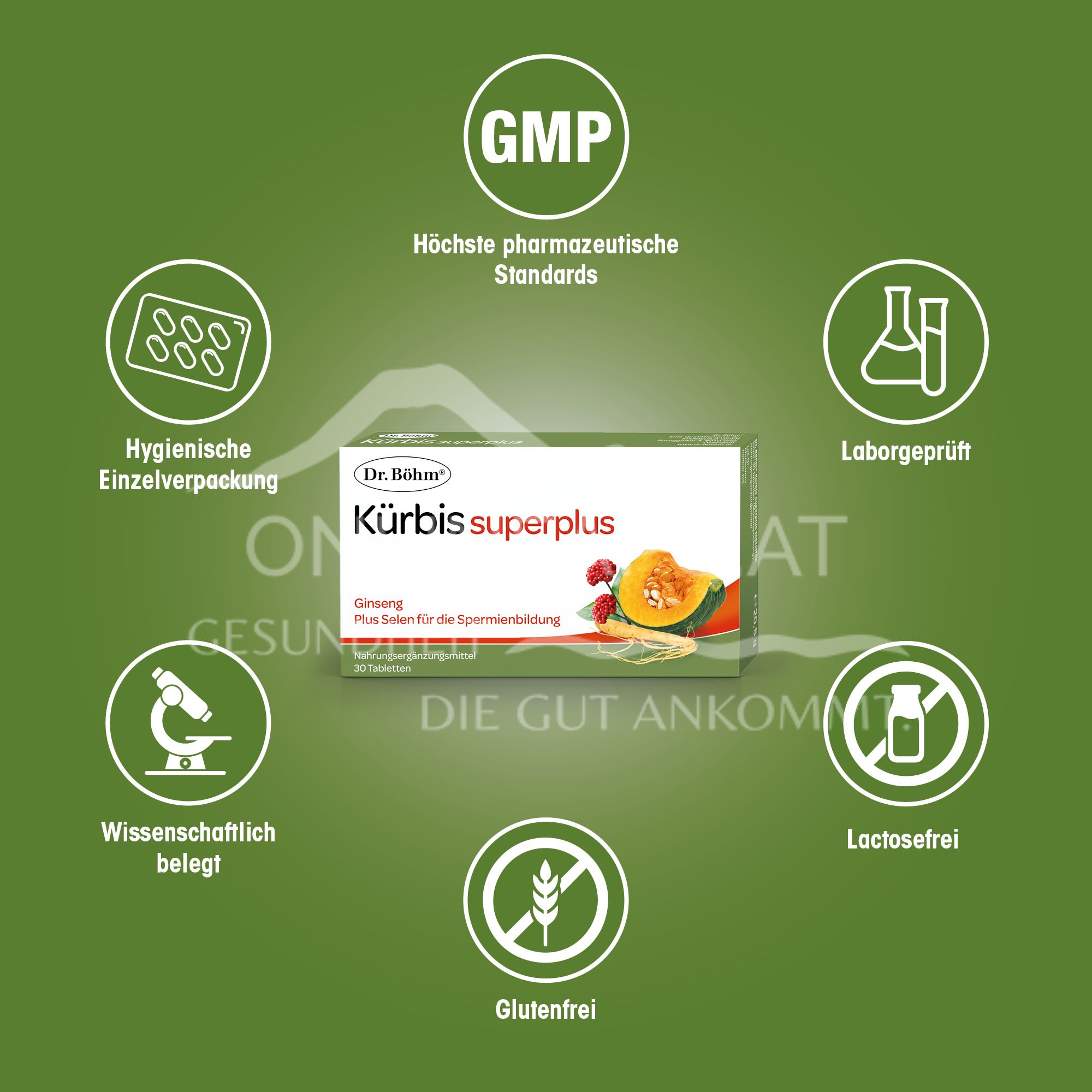 Dr. Böhm® Kürbis superplus Tabletten sind ein Nahrungsergänzungsmittel zur Unterstützung der Blase und Prostata. Mit Ginseng für die Manneskraft und Selen für die Spermienbildung.