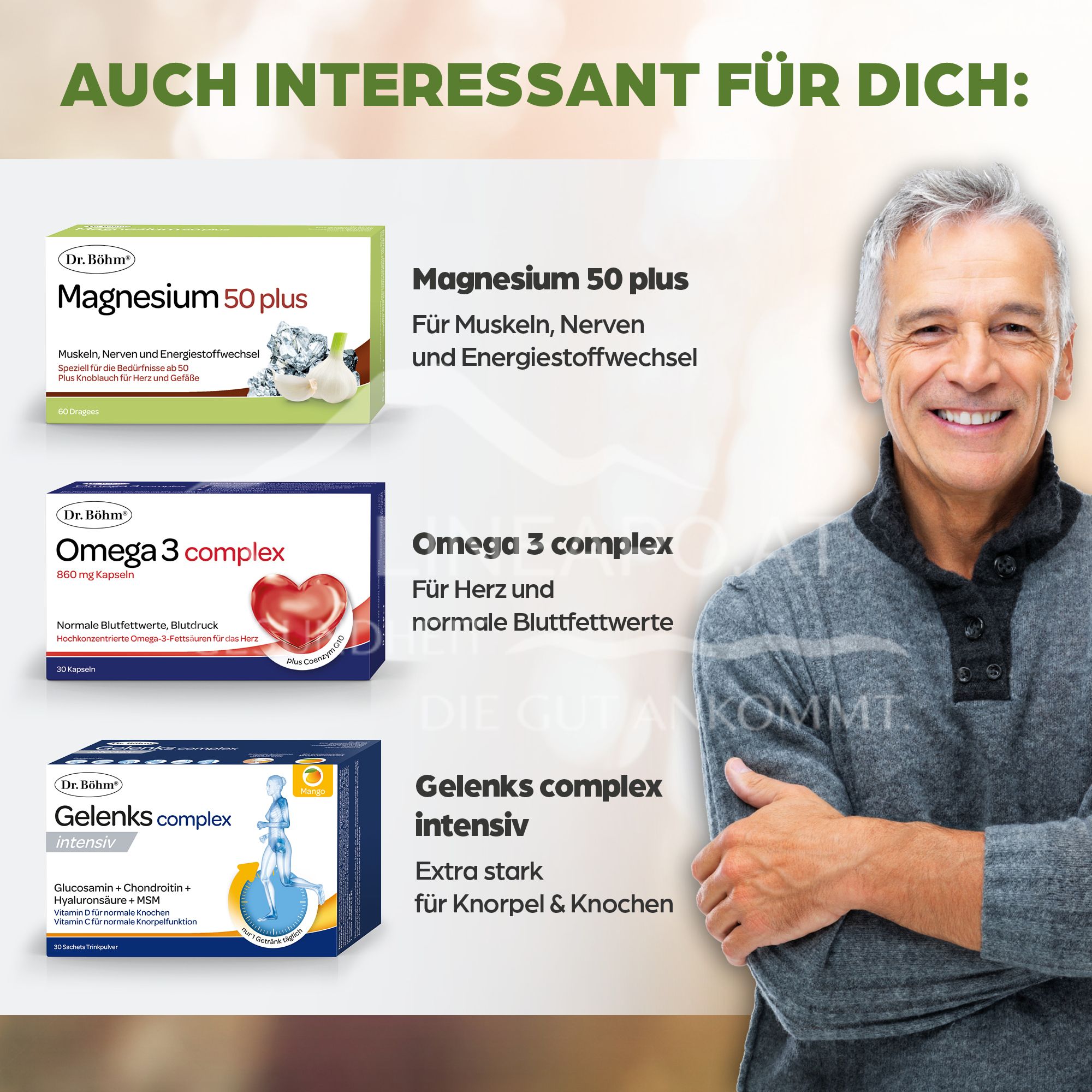 Dr. Böhm® Kürbis superplus unterstützt die Gesundheit Ihrer Blase und Prostata mit einem hochkonzentrierten Kürbis-Extrakt. Dieser wird in einem speziellen Verfahren aus dem Steirischen Ölkürbis gewonnen und unterstützt so einen normalen Harnfluss sowie eine gesunde Prostata. Ebenfalls wertvoll für die Männergesundheit: Ginseng wirkt vitalisierend und unterstützt die sexuelle Gesundheit, Selen fördert die Spermienproduktion.