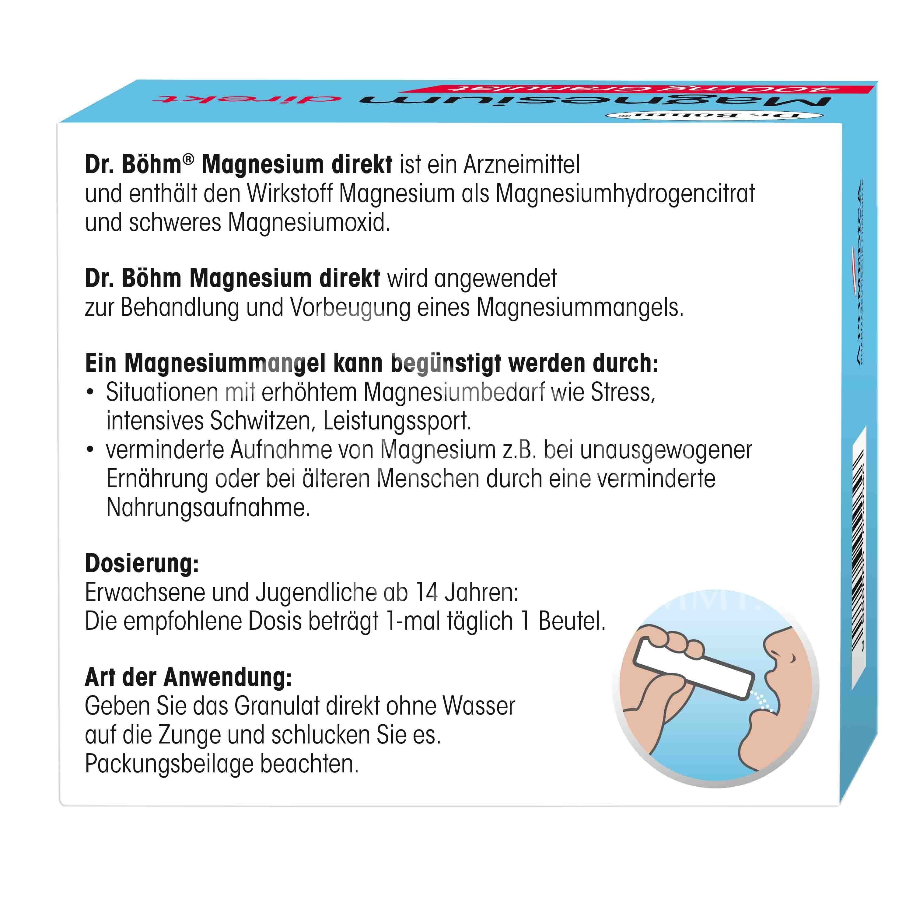 - Dr. Böhm® Magnesium direkt 400 mg Granulat ist für Jugendliche ab 14 Jahren sowie Erwachsene geeignet und kann auch in der Schwangerschaft und Stillzeit eingenommen werden.